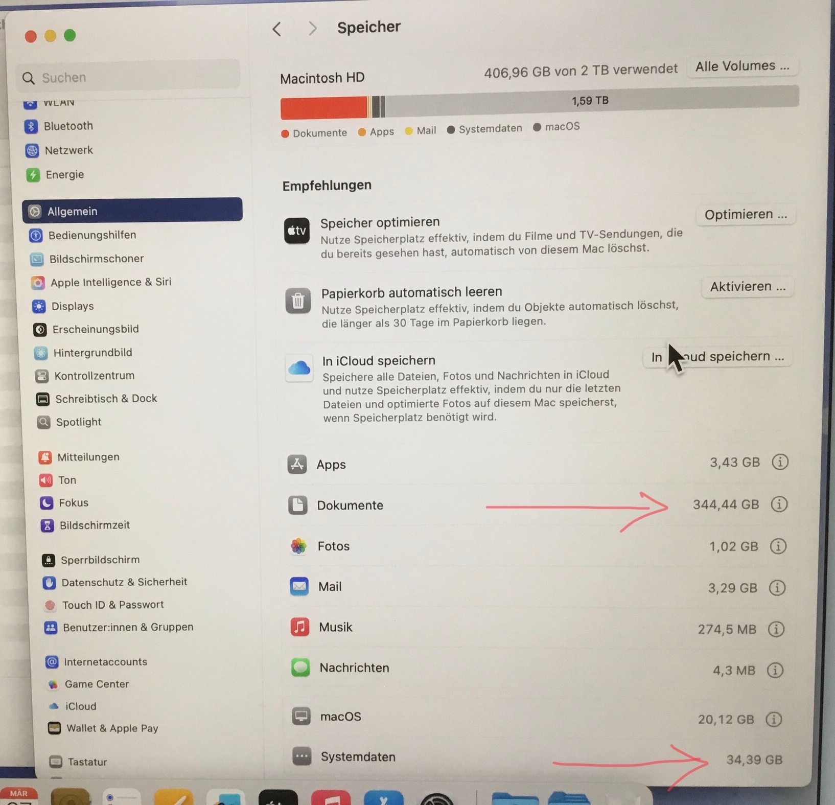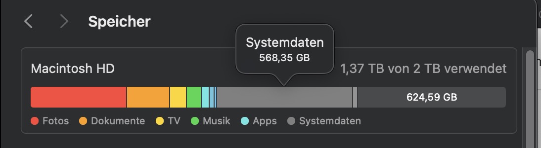 Mein Mac ist kein iMac, sondern ein MacBook Air, bei dem ich nicht ständig das Backup Laufwerk angeschlossen haben kann. Da werden die Systemdaten deutlich größer, weil das System den freien Speicher auch nutzt, um lokale Schnappschüsse zu speichern, bis das backup Laufwerk wieder erreichbar ist. aber solange ich genug Speicher habe, um arbeiten zu können, gönne ich dem System den freien Speicher für temporäre Daten, selbst wenn es gelegentlich unverschämt groß wirkt. Im wesentlichen sind die Systemdaten bei mir downloads von großen Mediendateien aus der iCloud, Bilder, Filme, Musik, und daß das System die letzten downloads nicht gleicht wieder löscht, schont meine WLAN Datenrate und macht den Mac schneller, weil ich nicht immer wieder auf downloads warten muß.