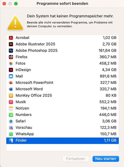 Ich bekomme alle paar Tage das Fenster Programme sofort beenden mit der Warnung: „Dein System hat keinen Programmspeicher mehr. Beende alle nicht verwendeten Programme, um Probleme mit deinem Computer zu vermeiden."