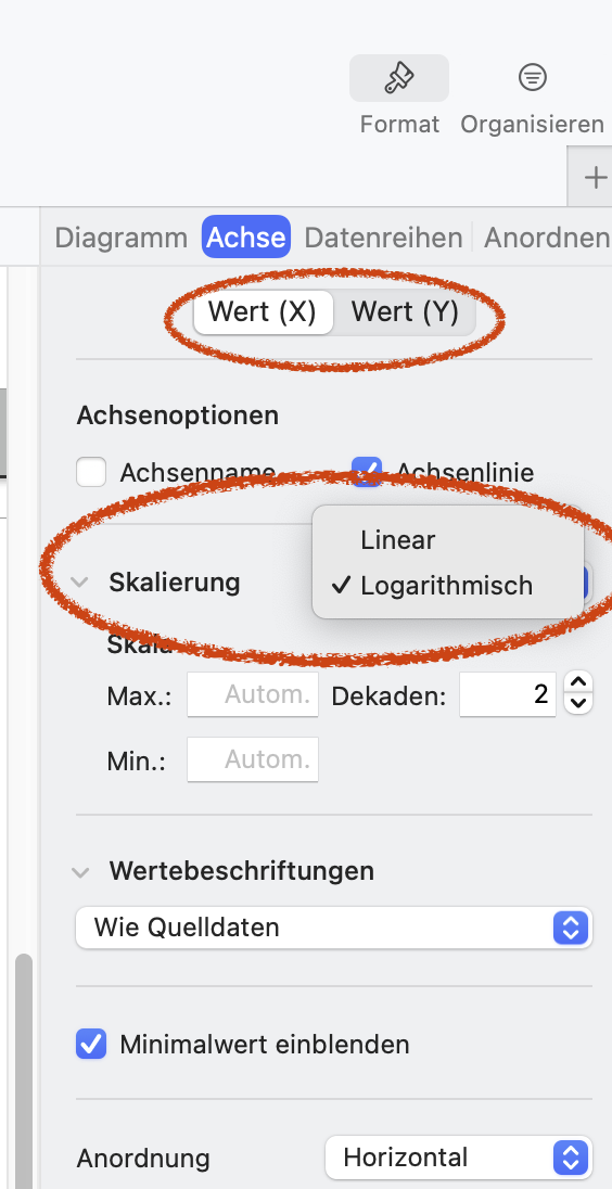 Dort gibt es u.a. die Möglichkeit, zwischen Linear und Logarithmisch zu wählen, ferner kannst du Min/Max-Werte sowie die Dekaden einstellen. Diese Einstellmöglichkeiten hast du für beide Achsen, X und Y!