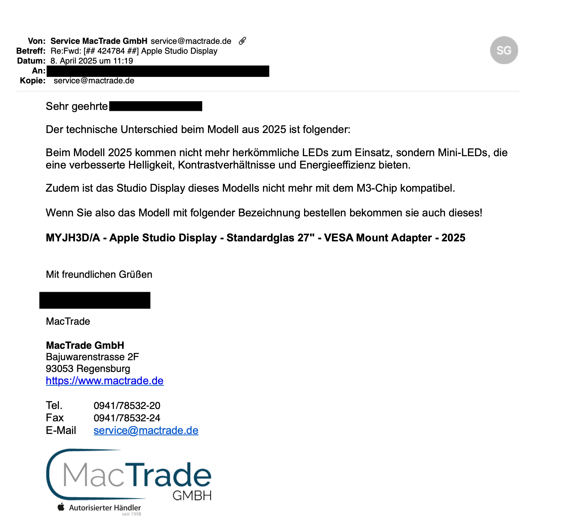..soeben nochmals mit dem Technischen Vertrieb von mactrade telefoniert. Es ist seitens Apple "nur" die Verpackung angepasst worden und deshalb die Bezeichnung 2025. Technisch k.Ä.