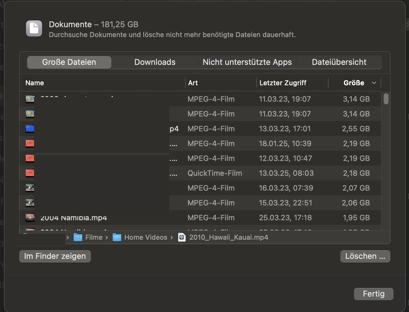 Wir könnten statt nach der Größe auch gezielt nach dem Dateitypen suchen , um die üblichen Verdächtigen dingfest zu machen, Videos, Bilder, Präsentationen, Installer, also nach .pkg, .mov, .img, .mp4 usw. suchen.