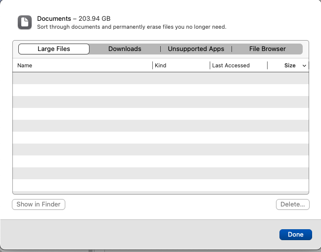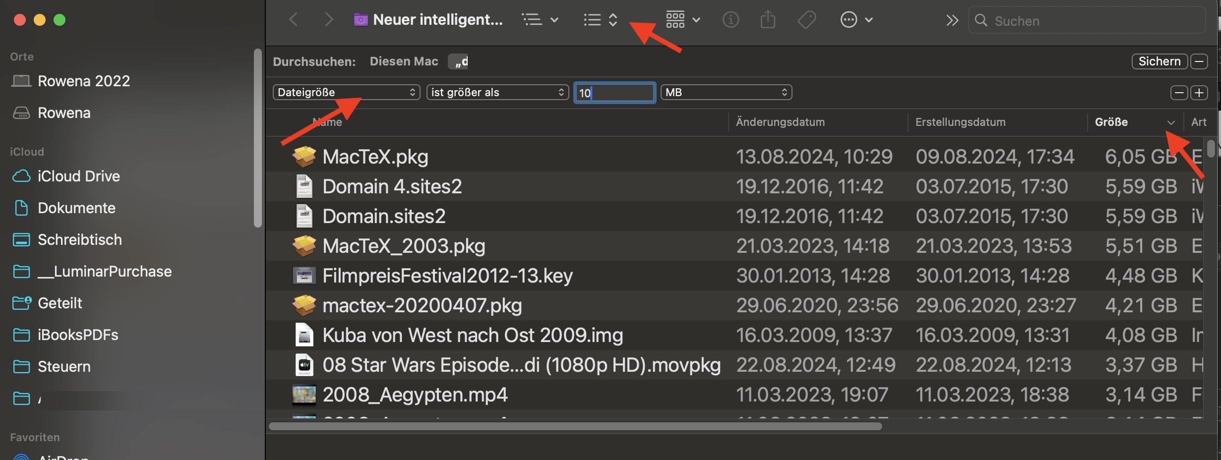 - Das Finder Fenster sollte in Listendarstellung sein und die Größenspalte angezeigt werden. Dann kann man auf den Titel der Größenspalte klicken, um die angezeigten großen Dateien absteigend nach der Größe sortiert anzuzeigen.