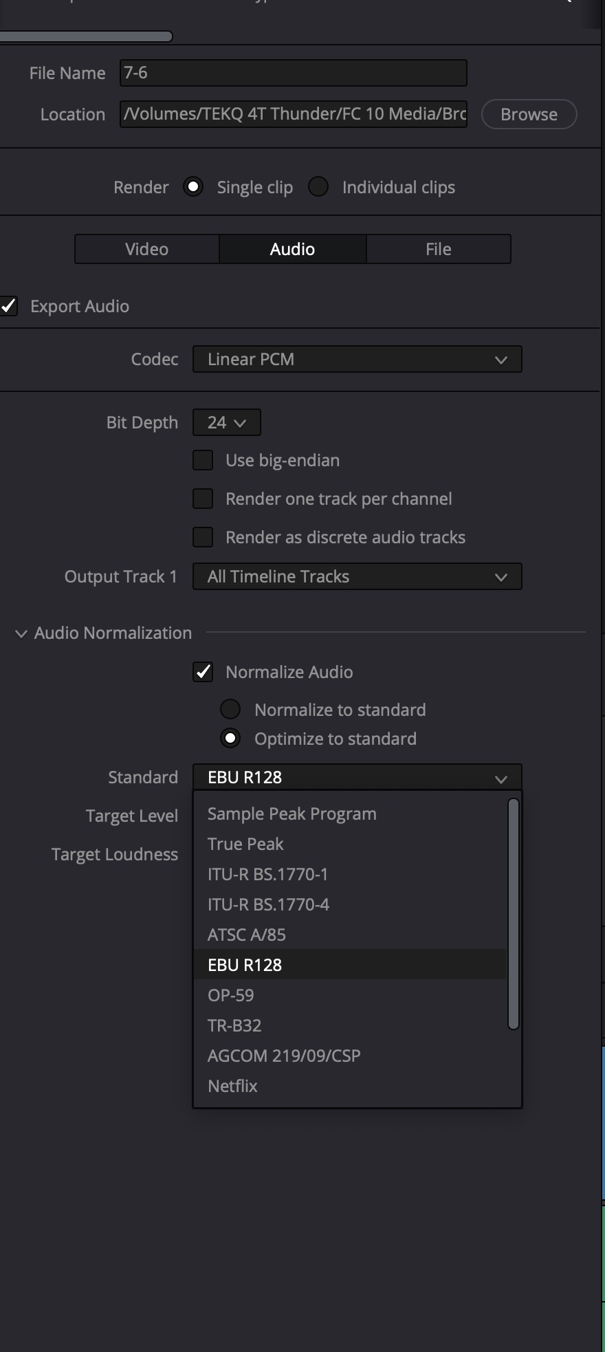 Auch das kostenlose Davinci Resolve bietet an mindestens 2 Stellen die internationale Profi-Normalisierung an.