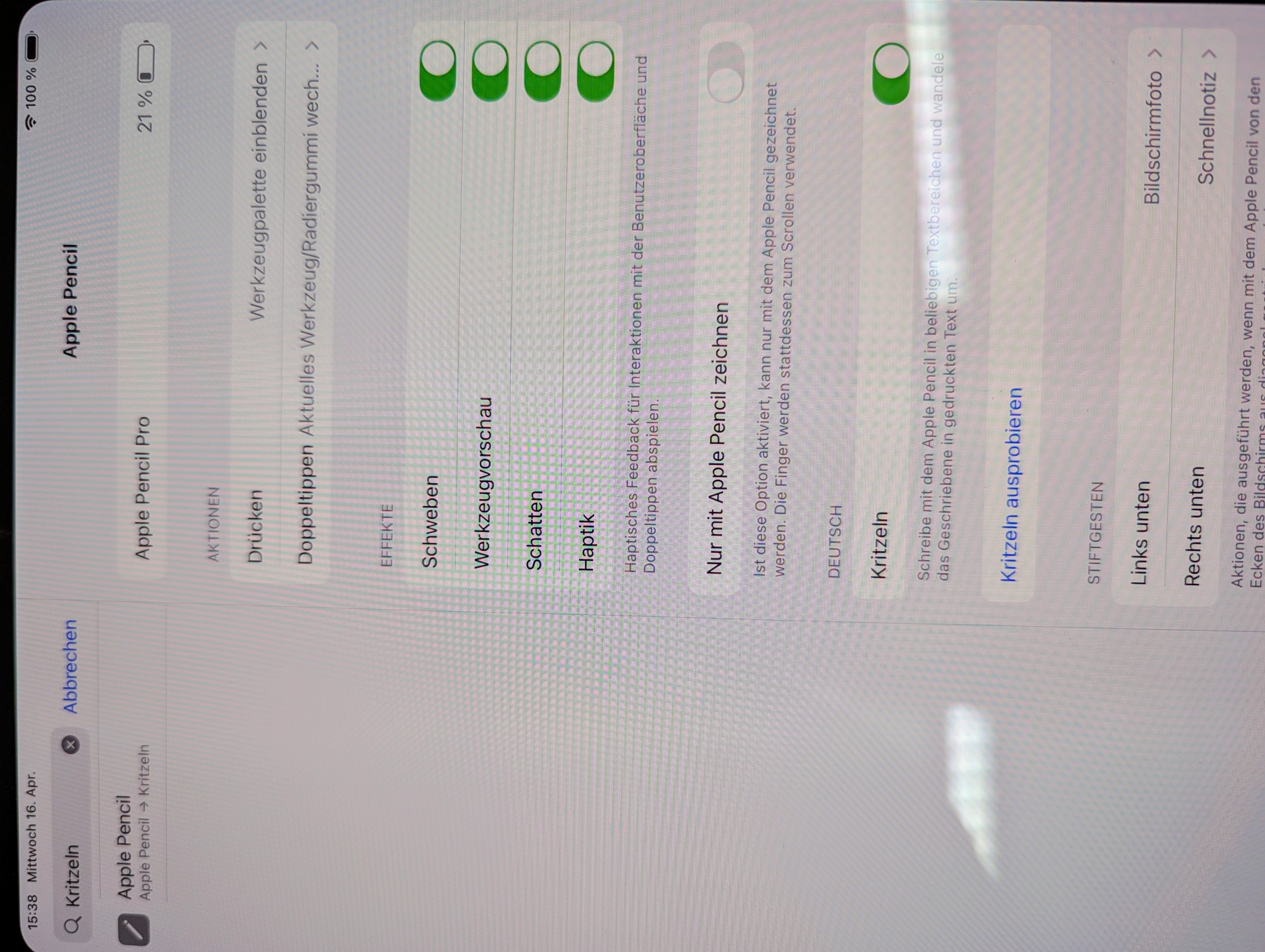 Angeblich würde das "Kritzeln ausprobieren" nicht funktionieren. Generell ist der Stift mit dem iPad verbunden und andere Funktionalitäten des Stiftes funktionieren einwandfrei. In den Einstellungen scheint auch alles zu passen.