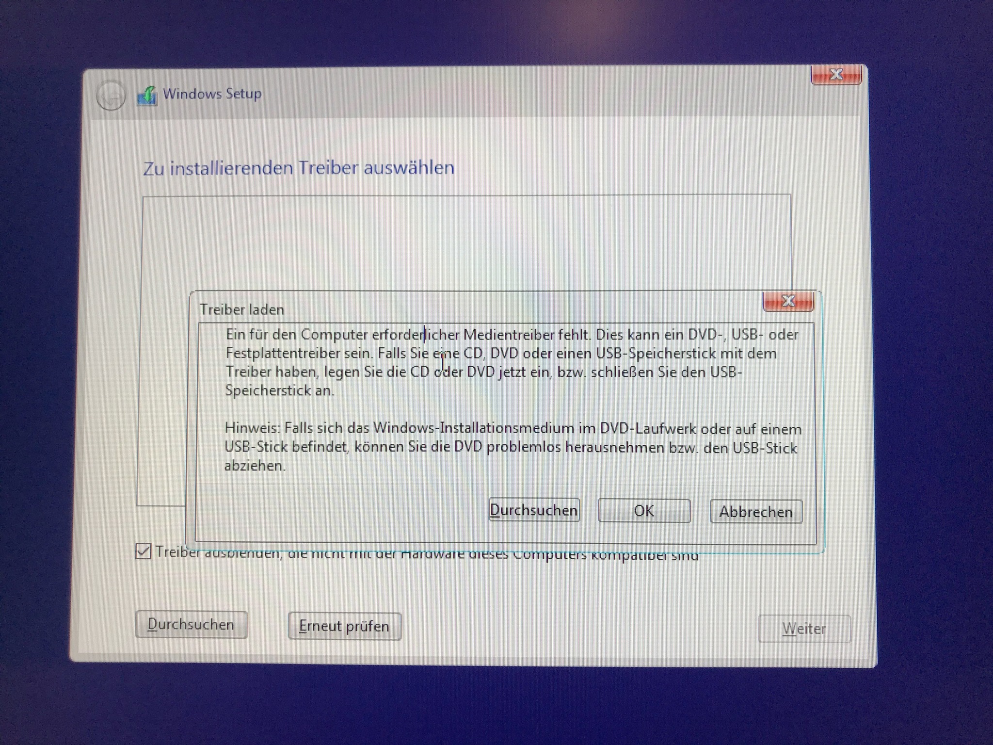 Die Installation startet auch aber dann kommt dierekt nach der Länderauswahl die Fehlermeldung es würden CD-ROM | USB Treiber fehlen,