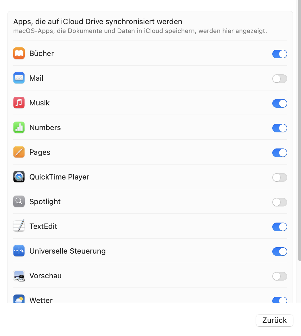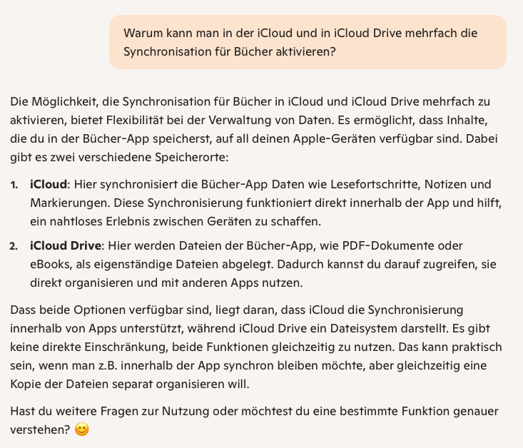 Bei der Bücher-App zum Beispiel sieht man eh nichts im iCloud Drive-Ordner. In den Apple eigenen Dokumenten finde ich hier keine klare differenzierte Erklärung, warum ein und dieselben Apps an zwei Stellen die Auswahl ermöglichen, der Support am Telefon konnte mir das auch nicht erklären.