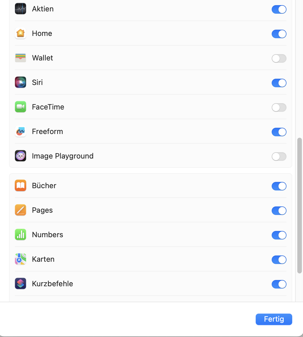 Support-Texte suche ich dann, wenn ich sie brauche. Konkret zu diesem Thema habe ich keine gefunden, seit Ventura. Bis MacOS Monterey (habe ich noch auf dem Mac mini 2014, gerade noch einmal gegengeprüft) war das auch nicht nötig, denn dort war mit einem Schieber alles ENTWEDER in den iCloud- ODER den iCloud-Drive-Settings erledigt. Mit Ventura kam dann irgendwann für die Apps, die Metadaten beinhalten, eine Trennung zwischen Metadaten (nennen wir sie einmal so) UND den eigentlichen Dateien. Dort, wo es NUR Dateiabgleiche gibt, bspw. bei Whatsapp, findet man auch jetzt nur einen Schieber in den iCloud Drive-Settings, nicht aber in den iCloud-Settings. Dies erscheint nun auch logisch. Sowas sollte Apple aber nicht erst im Support landen lassen, sondern anständig beschreiben.