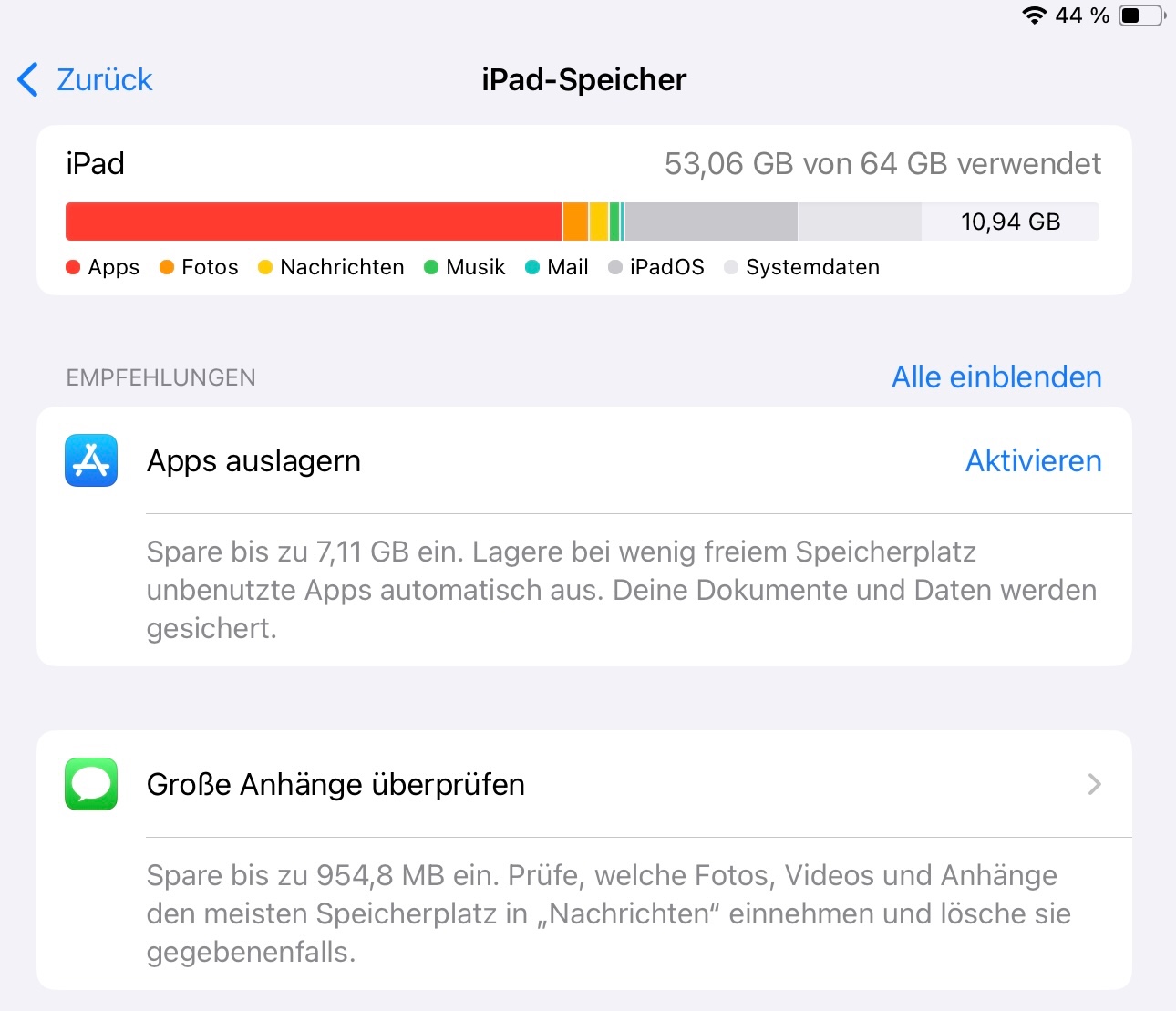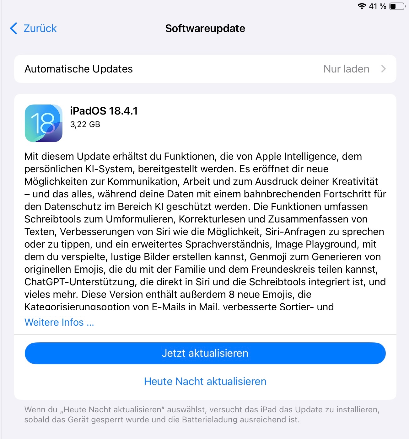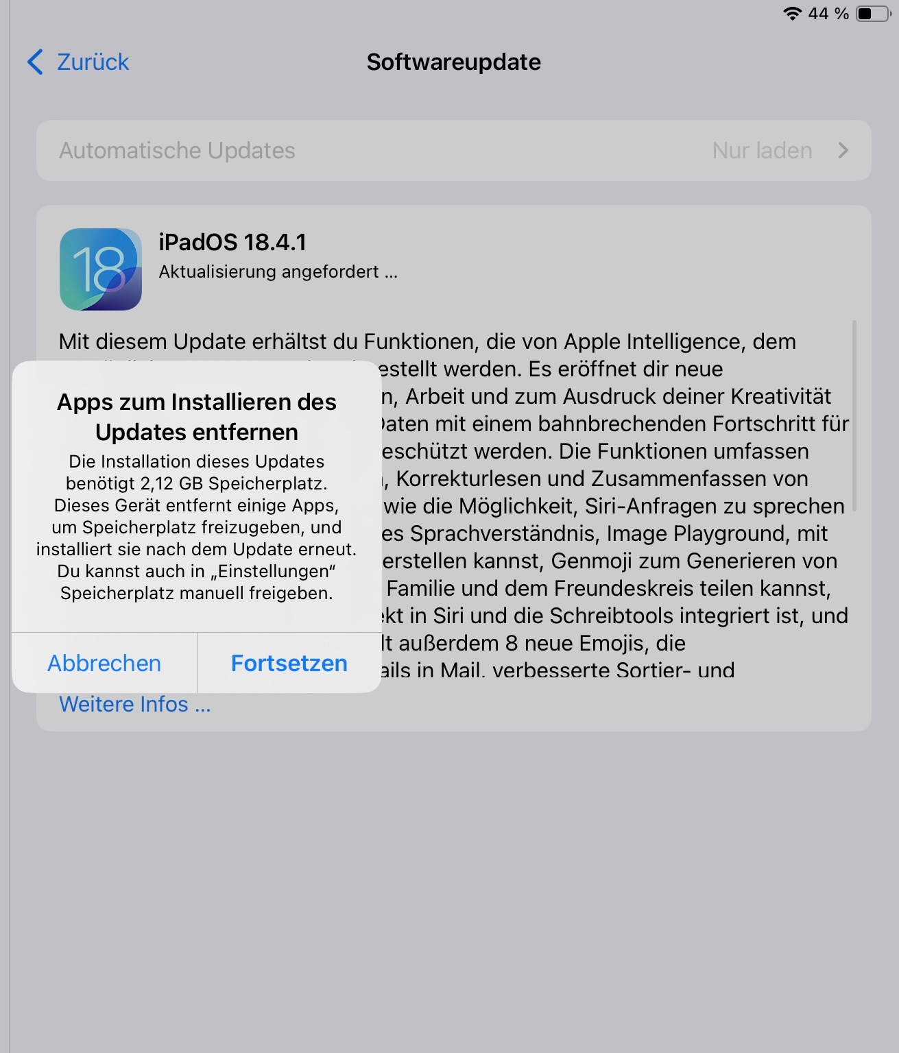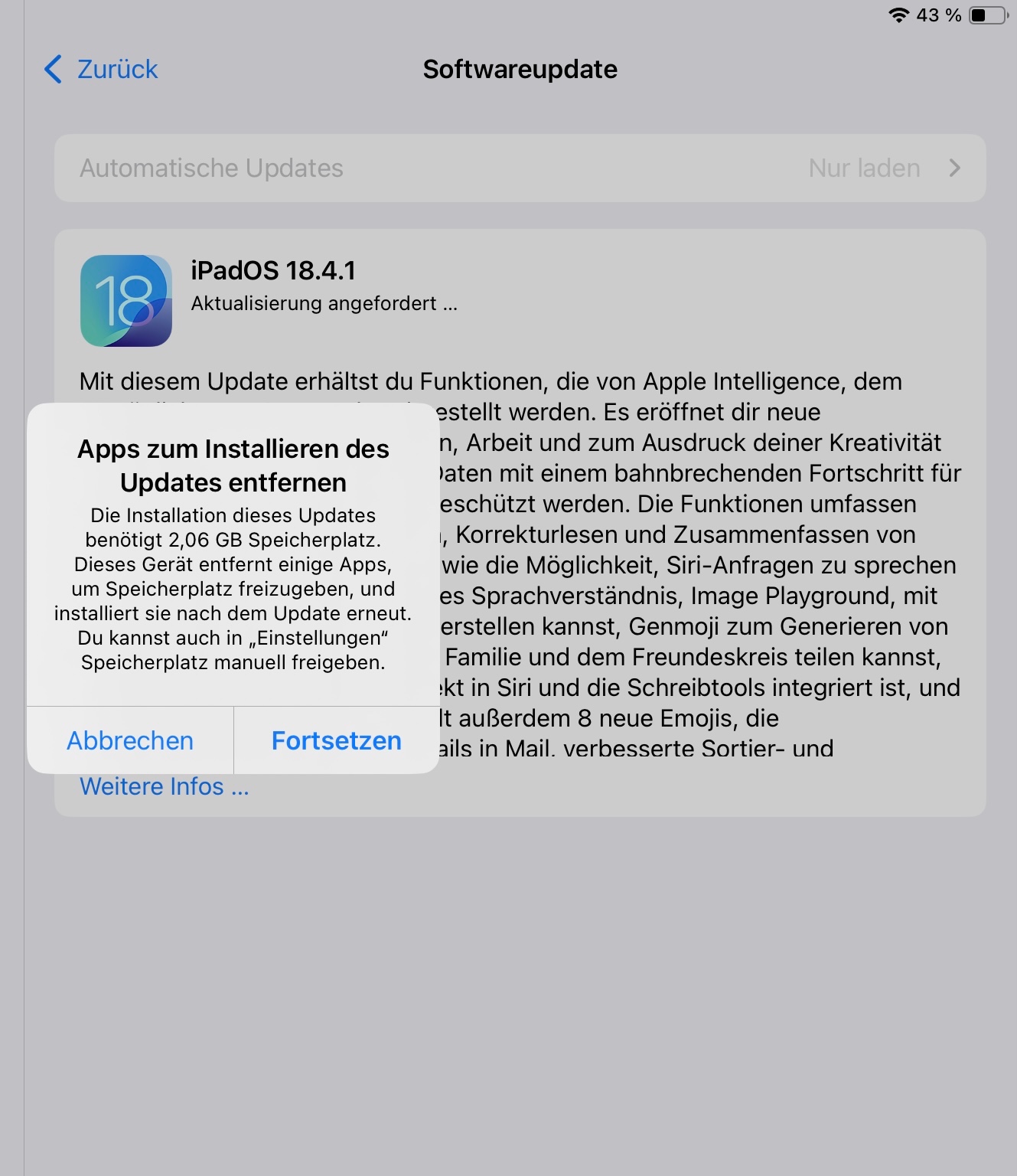 iPad hat angeblich nicht genug freien Speicher für Update auf iOS 18.4.1