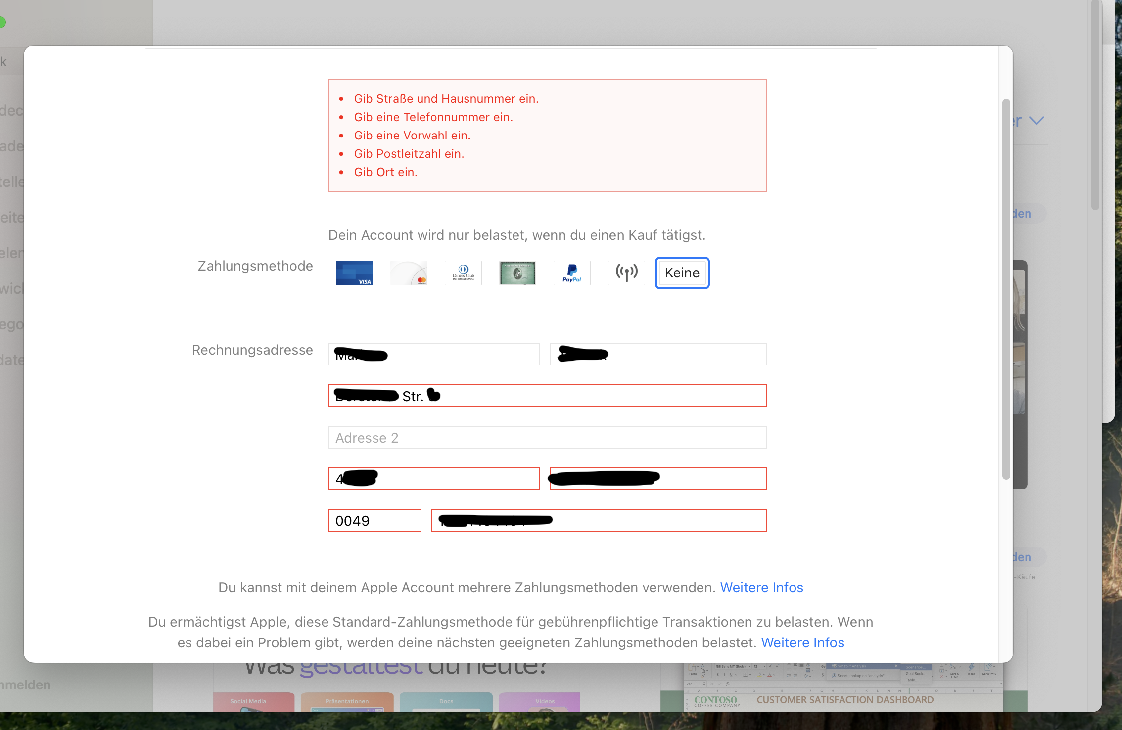 Jetzt kommt das Höllenformular "Vervollständige deinen Apple Account". Ich wähle Zahlungsmethode "Keine" (Habe es auch schon mit Paypal ausprobiert) und gebe meine Rechnungsadresse an (wozu eigentlich, die habe ich auch über appleid.apple.com eingetragen). Also Adresse 1, PLZ, Stadt, Vorwahl und Telefonnr. eingetragen und auf "Weiter" geklickt.