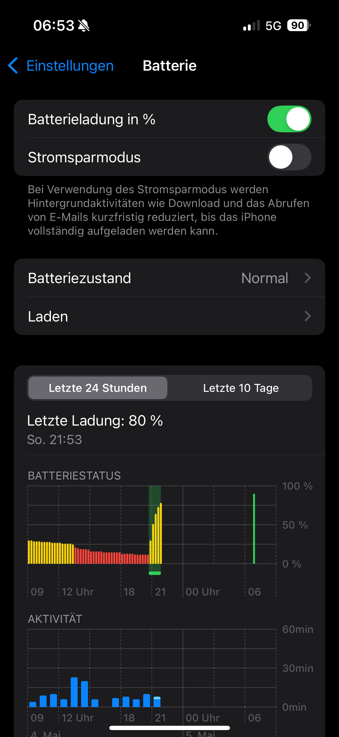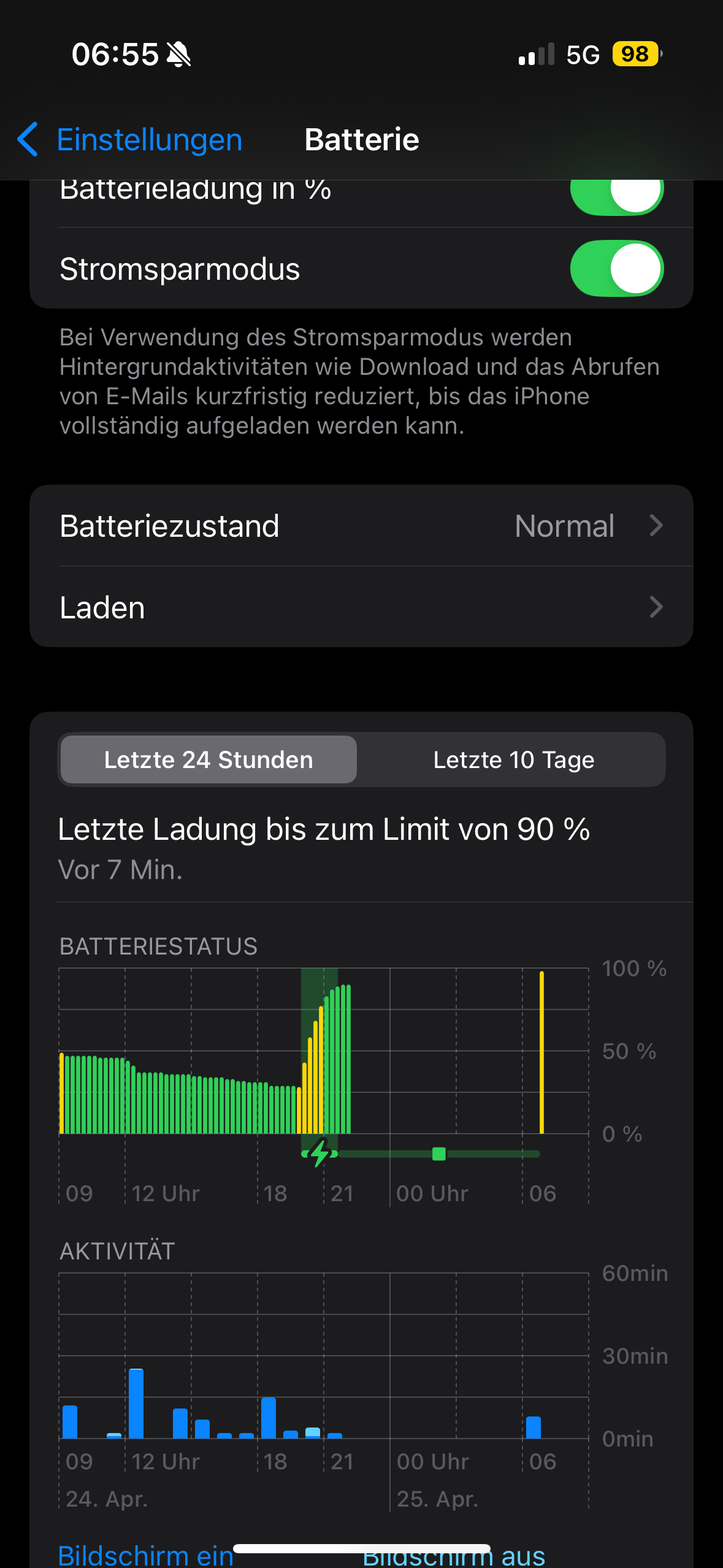 Dann habe ich noch das Problem, das wenn ich die Ladegrenze auf zum Beispiel 90 Prozent setze, mein Handy 90% anzeigt, aber es nachdem ich einen Neustart gemacht habe, 98% geladen hat. Mein iPhone zeigt auch an, das es ohne Ladegeräte (kein Kabel und auch nicht induktiv) geladen hat (siehe Fotos).