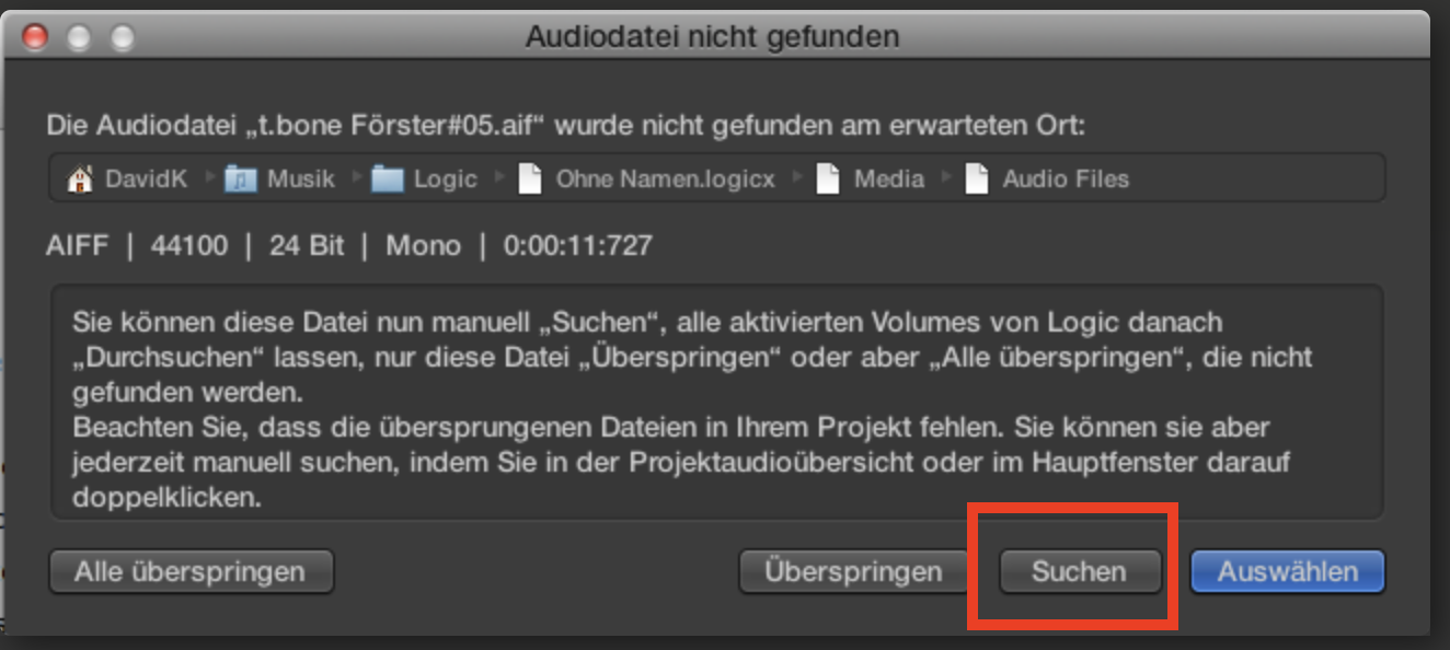 Du wirst beim Starten den Projekts in einem Fenster daran erinnert, dass die Audio Files fehlen. In diesem Fenster auf "Suchen" drücken, dann werden die Audio Files auf allen angeschlossenen Volumes gesucht. Eventuell musst du noch das richtige File auswählen, falls mehrere gleichnamige Files gefunden werden.