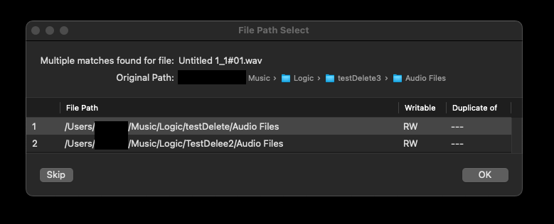 Nachdem du "Suchen" gedrückt hast, sollte ein Fenster aufgehen sobald sich mehrere gleich-benannte Audiofiles auf den angeschlossenen Volumes befinden.