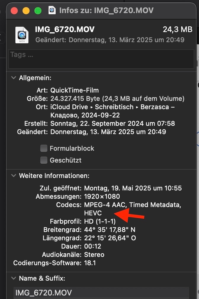 Bei mir sehe ich beispielsweise solche Angaben im Finder, wenn ich die Info für ein QuickTime Video öffne: