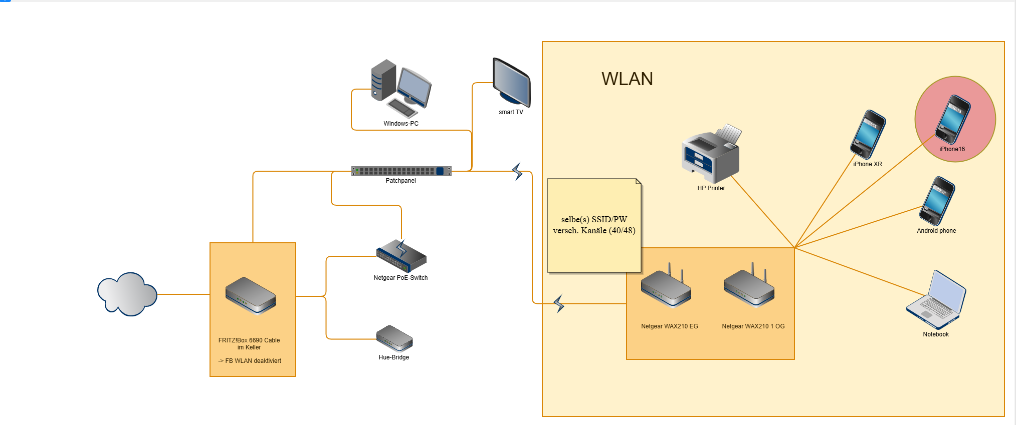 Sowohl im EG, als auch im 1. OG hängt ein SME AP von Netgear. Auf beiden ist je 1x 2,4GHz SSID und 1x 5GHz SSID mit unterschiedlichen Namen konfiguriert die beiden APs senden auf unterschiedlichen Kanälen.