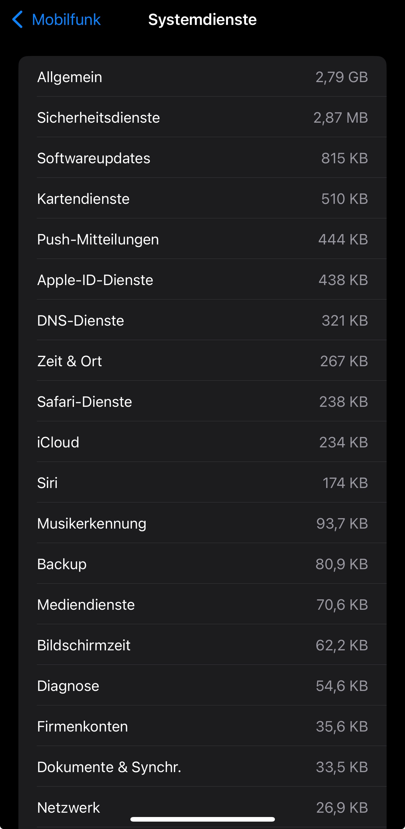 Hab jetzt wirklich alles deaktiviert, was so geht abseits die mobilen Daten komplett auszuschalten und war nach gestern Abend und heute Morgen guter Dinge, dass das geholfen hat. Hab um 0542 meine Datenzähler zurückgesetzt nur um jetzt 2,79GB an Daten für Systemdienste—>Allgemein zu sehen, was zur Hölle???