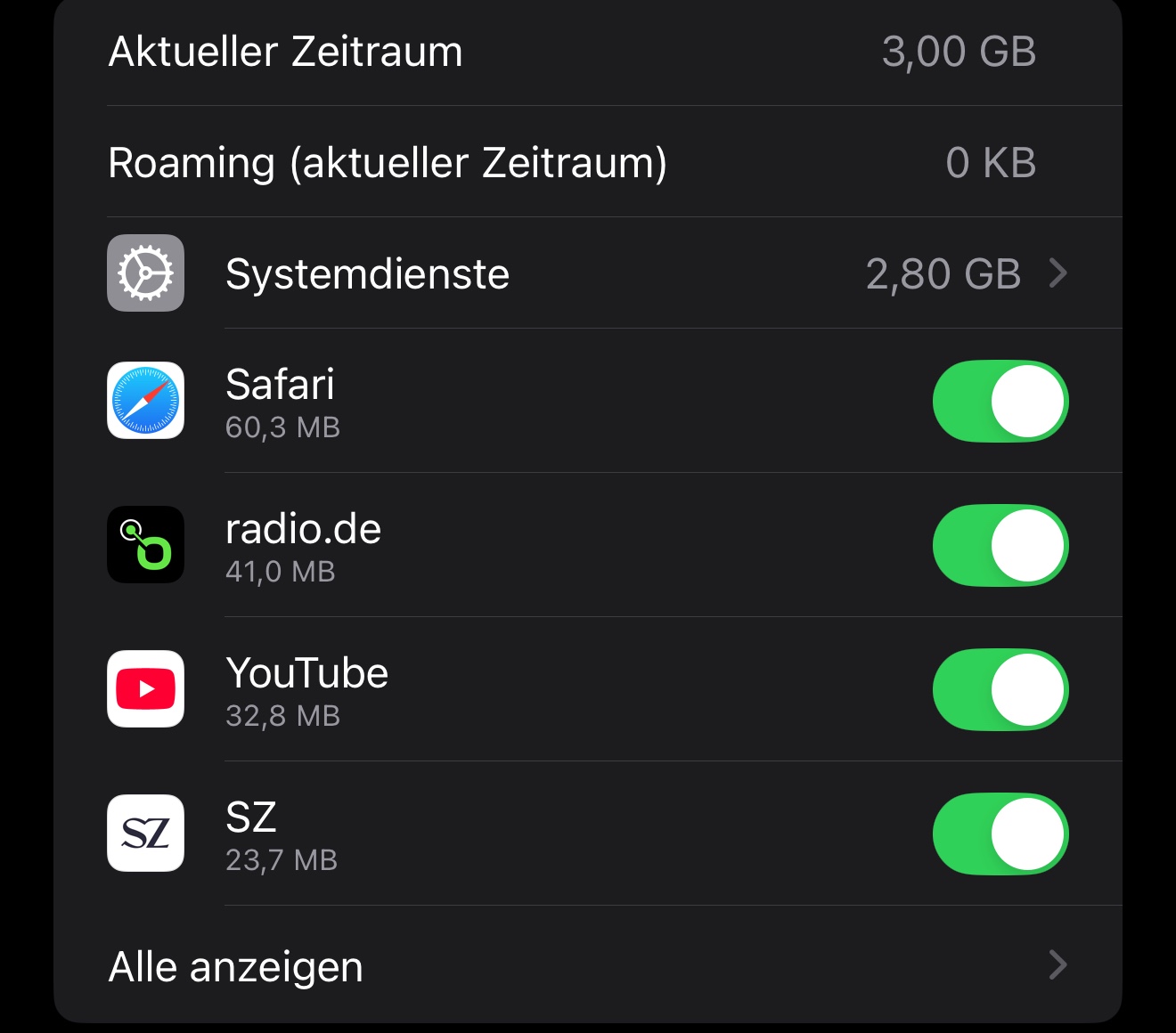 ich hab heut den ganzen Morgen das Radio verwendet, mein Navi, bissl YouTube und Safari und 93% meiner verbrauchten Daten kommen von irgendwelchen Systemdiensten?