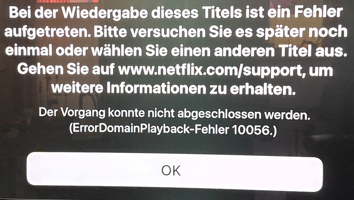 mal eine Frage kennt einer den Apple TV Netflix Fehler ( ErrorDomianPlayback-Fehler 10056 ). Wenn ich einen Netflix Film im Apple TV mit meinen AirPods Pro 2 schaue und den Film pausiere kommt diese o.g. Fehlermeldung. Ich kann den Film dann nicht ganz normal mit Play weiterschauen und muss erst bei Netflix den Film auf fortsetzen klicken. Wie kann man den Fehler beheben. Ich habe das Apple TV schon neu gestartet und es ist die neueste tvOS Version drauf. Wenn man auf Netflix Support geht wie oben in dem Bild angezeigt und den Fehler mit der Nummer eingibt findet man nichts zu dem Fehler, Fehlermeldung existiert nicht. Ich habe auch die App schon gelöscht neu installiert und mich mit meinem Account angemeldet, die Fehlermeldung kommt dann auch immer wieder.