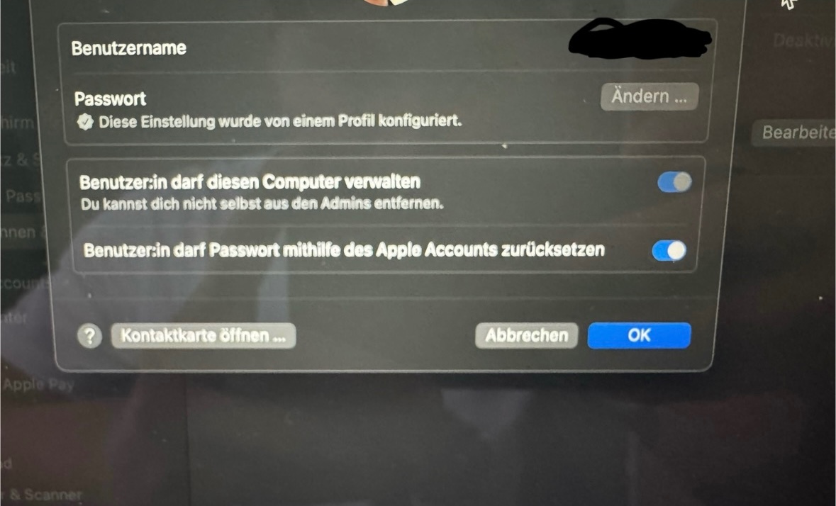 Hallo kann jemand mir helfen. Zwar ich möchte auf meine MacBook Air meine anmelde Passwort ändern aber es ist grau also ich kann nicht drauf klicken und unten steht mit eine Stern „diese Einstellung würde von einem Profil konfiguriert“ weis jemand was ich da machen muss ?