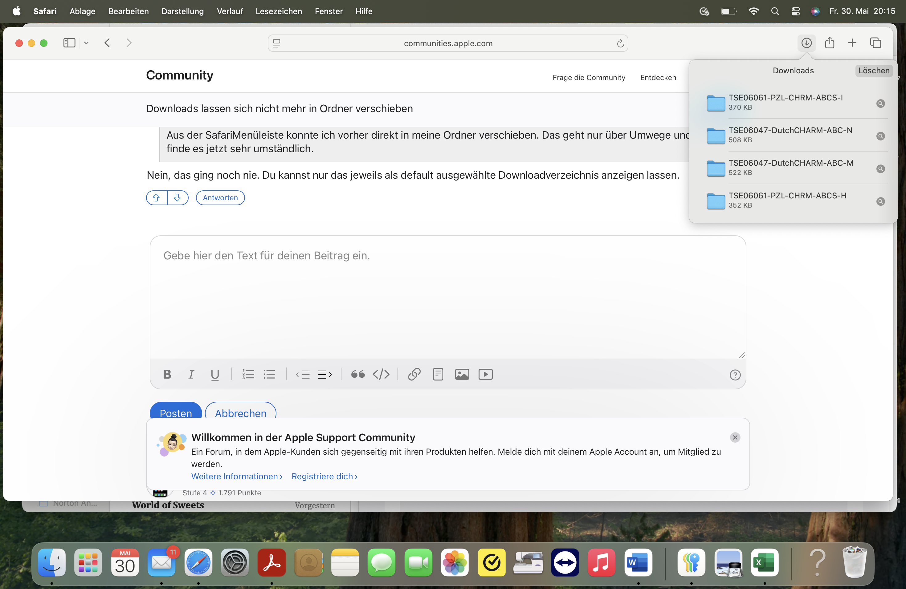 wenn ich Dich richtig verstehe, lässt sich ein heruntergeladener Ordner (z. B. TSE06061-PZL-CHRM-ABCS-I) aus dem Downloads-Verzeichnis nicht mehr direkt aus Safari heraus in einen anderen Ordner verschieben, wie es früher möglich war – und Du empfindest die neuen Umwege über den Finder als umständlich. Das ist gut nachvollziehbar.
