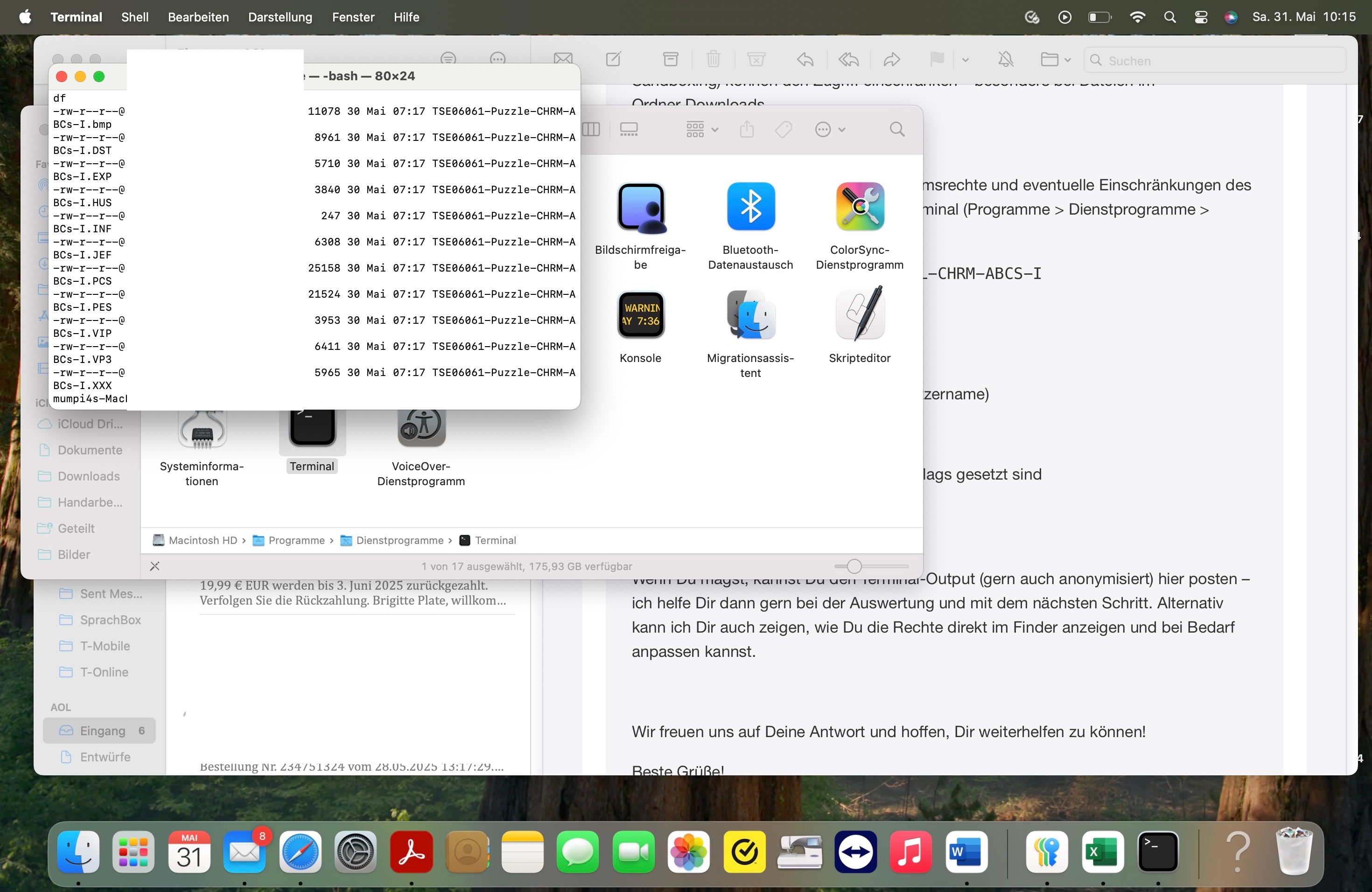 Wenn Du magst, kannst Du den Terminal-Output (gern auch anonymisiert) hier posten – ich helfe Dir dann gern bei der Auswertung und mit dem nächsten Schritt. Alternativ kann ich Dir auch zeigen, wie Du die Rechte direkt im Finder anzeigen und bei Bedarf anpassen kannst.