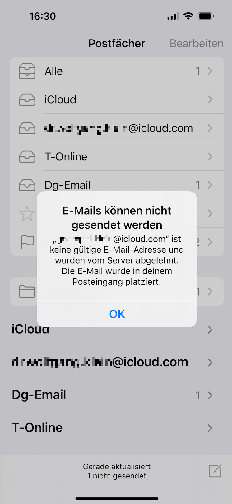Die Mail-Adressen sind aber alle korrekt. Abgesehen vom grammatikalischen Fehler im ersten Satz nach der Überschrift ist die Meldung insofern etwas schlampig als die nicht gesendeten Mails natürlich nicht im Eingang sondern im Ausgang platziert werden. Der Apple Support insinuierte, das Problem könne nicht an Apple liegen, aber dagegen spricht einfach die Wahrscheinlichkeit: