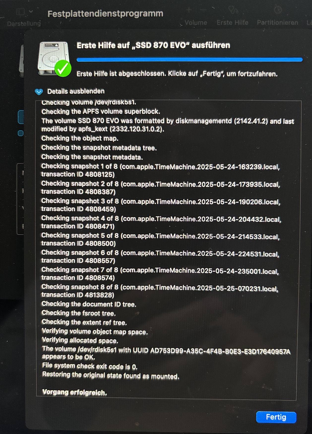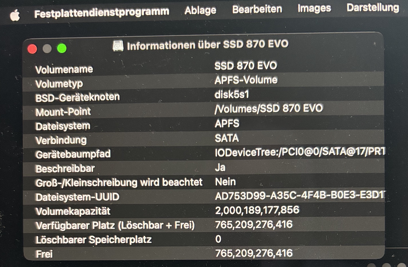 - Festplattendienstprogramm zeigt an: Beschreibbar - Ja