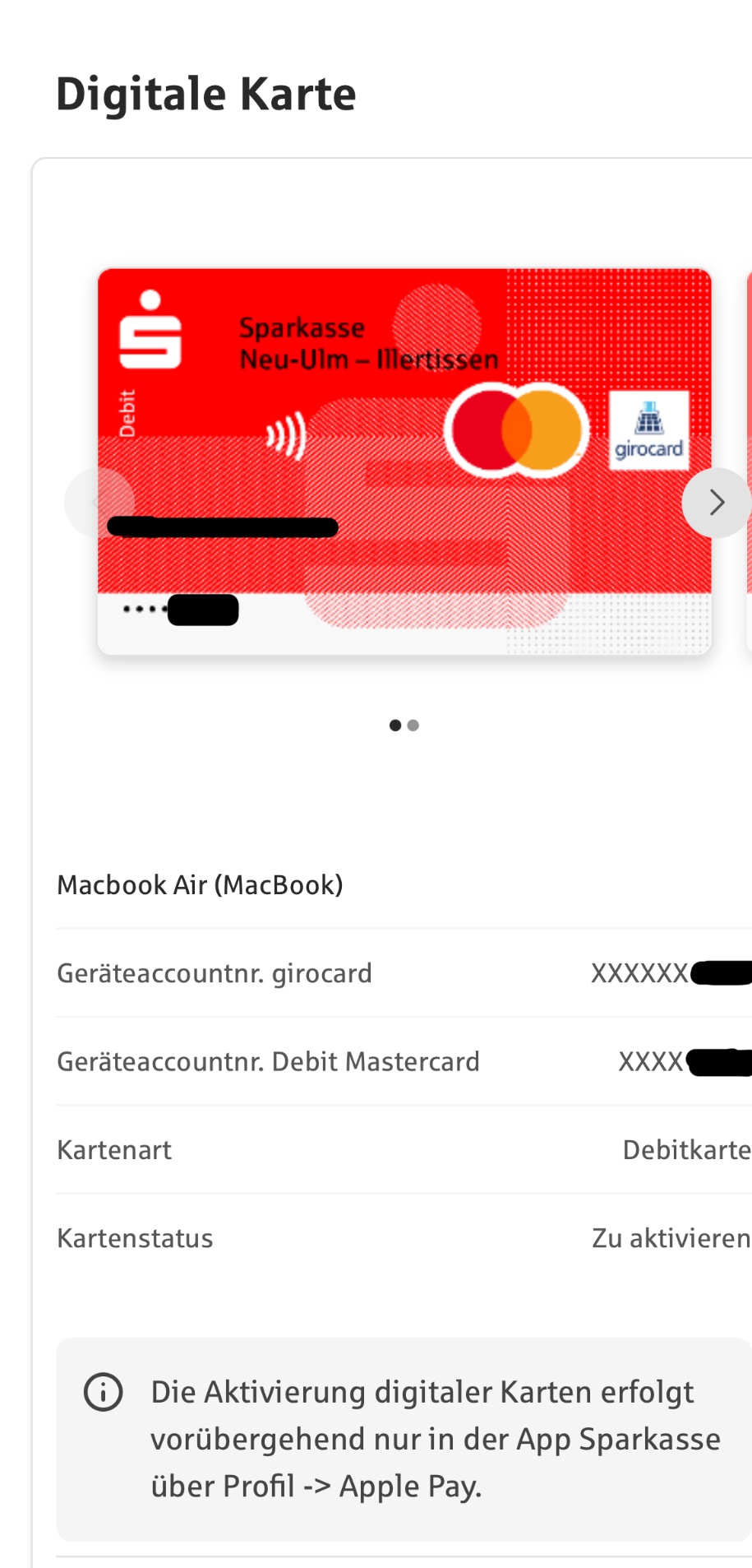 Dort wurden mir dann angezeigt, auf welchen Geräten meine Sparkassen Card und meine Mastercard bereits aktiv ist. Die Sparkassen Card wurde (wenn ich mich nicht täusche) auch für meinen Mac angezeigt, aber als "inaktiv". Es gab aber auch dort keine Möglichkeit der Aktivierung.