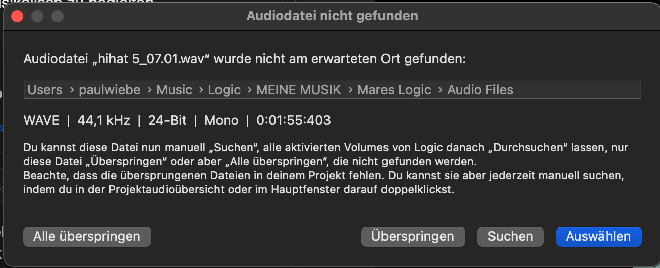 "Audiodatei "....." wurde nicht am erwarteten Ort gefunden", obwohl der Pfad angezeigt wird. (Mac mini 2018, Sequoia 15.5, Logic Pro 11.2)
