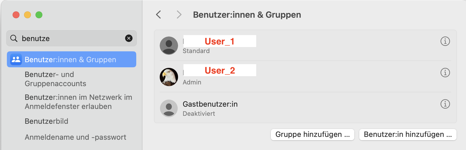 Ich danke für Deine Antwort. Bei mir ist nur ein Standard-Benutzer mit meinem Eigennamen und mit dem Zusatz "Apple Account" und ein deaktivierter Gastbenutzer vorhanden. Ich glaube, dass bei dem Software-Update auf meinem iMac 27 (2019) die Benutzer neu gruppiert wurden. Ich kann nur leider keinen Admin anlegen, weil für diese Änderung der Name des Admin und das Passwort eingegeben werden müssen und dabei mein Name als Standard-Benutzer mit dem Passwort, mit dem ich mich regelmäßig bei meinem iMac anmelde, stets abgelehnt werden. Wenn ich es mit den Zugangsdaten zu meinem Apple Account versuche, werden diese Namen- und Passworteingaben zwangsläufig auch nicht akzeptiert. - Ich habe bisher nur einmal bei der Inbetriebnahme meines iMac alles konfiguriert und stehe jetzt vor dem Problem dieser Änderung bei den Benutzern ohne Admin. Leider weiß ich noch immer nicht, wie ich das Problem lösen kann.
