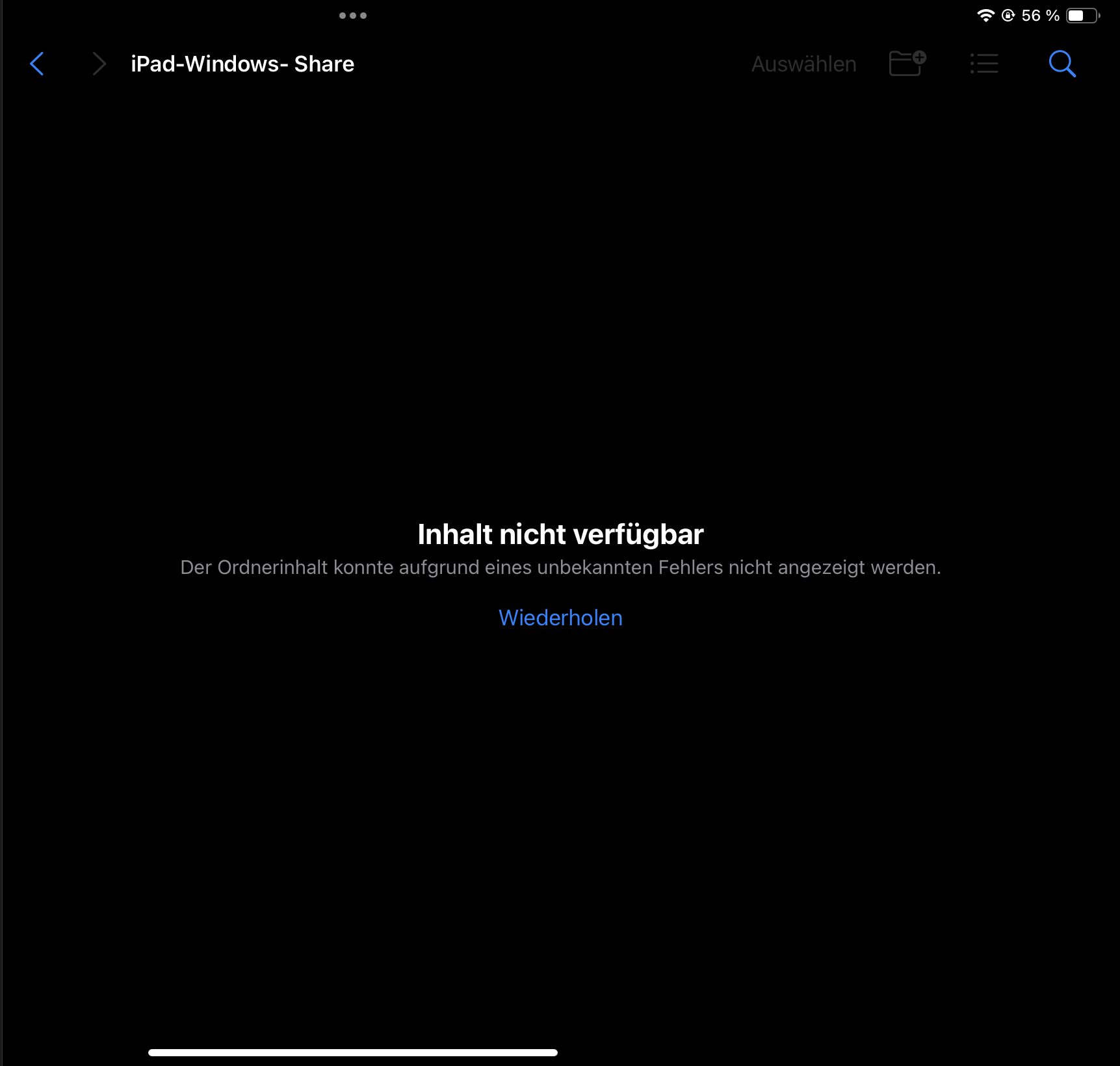 ich versuche gerade, auf dem iPad den Zugriff auf eine Windows-Freigabe per smb einzurichten. Die Freigabe an sich funktioniert ja noch. Der freigegebene Ordner wird erkannt. Aber es kann der Inhalt im freigegebenen Ordner nicht angezeigt werden.