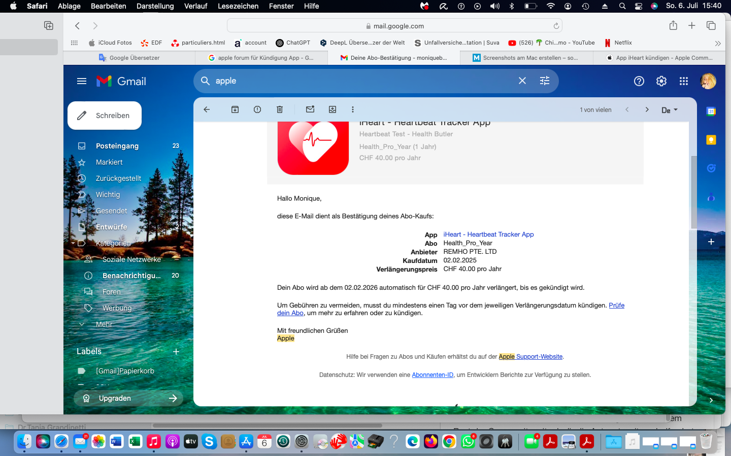 Ich bin verzweifelt. Seit 2 Stunden suche ich die Möglichkeit, eine App zu kündigen, die ich vor knapp einem Jahr gekauft habe und welche völliger Blödsinn ist. Sie heisst iHeart und misst die Herzfrequenzen u.a. Bald wird sie automatisch erneuert, aber ich kann sie nicht kündigen. In den beiden Mails, die ich damals von Apple bekommen habe führt der Link für die Verwaltung/Kündigung nicht zum gewünschten Ziel. Auch eine Mailanfrage wird von Apple nicht beantwortet wie auch nicht von iHeart selber. Kann mir da jemand weiter helfen? Vielen Dank im Voraus