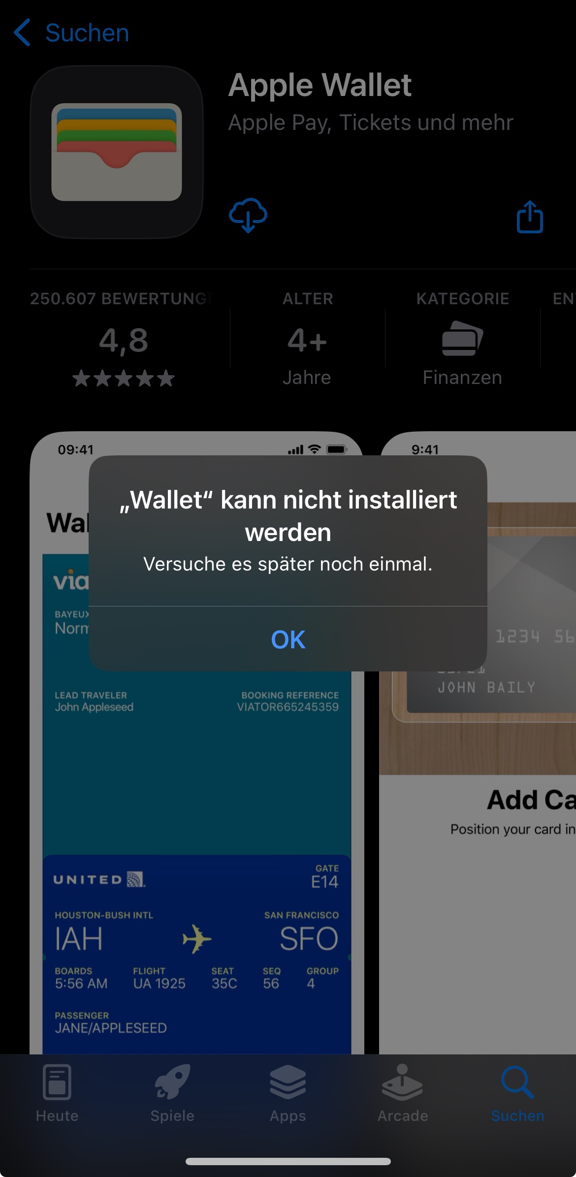 ich will die Wallet App wieder installieren, aber es kommt immer: