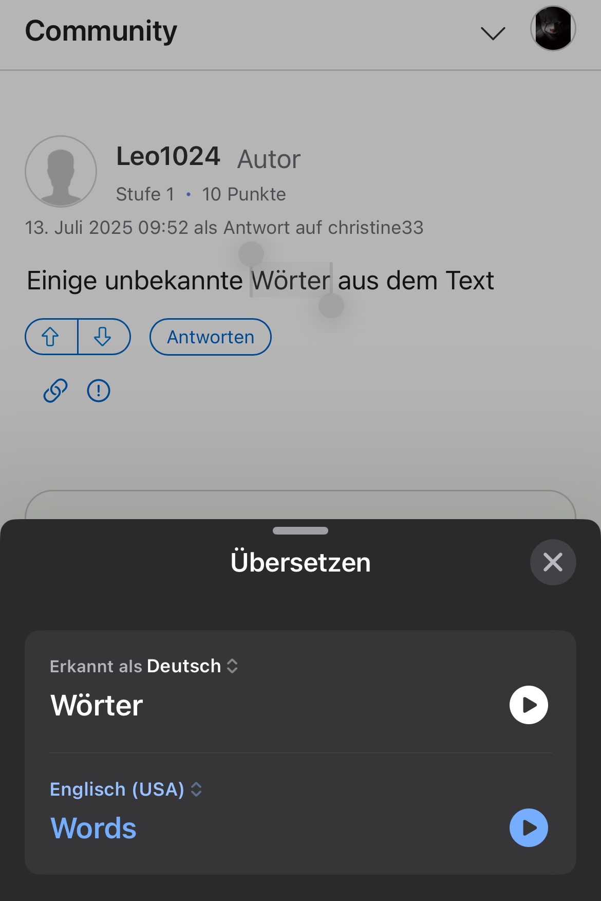 ne kurze Frage. Wenn ich in Safari ein Wort markiere und in Context Menü übersetzen click, wird mir Auswahl von Spachen gezeigt, scheinbar wo dieses Wort zu finden ist. Ich muss dann immer Sprache wählen. Es nervt. Kann man i.-wie Voreinstellungen vornehmen, weil ich Ausgangssprache immer kenne und will nicht es immer eingeben müssen?