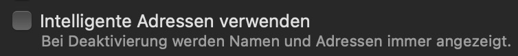 Wenn Du in der Mail-App auf Deinem Mac unter macOS nur den Namen und nicht die vollständige Adresse siehst, kannst Du das ändern: Öffne die Mail-App → Mail‑Menü → Einstellungen und wechsle zum Tab „Darstellung“. Dort findest Du die Option „Intelligente Adressen verwenden“. Wenn Du das Häkchen entfernst, zeigt Mail den vollständigen Namen und die E-Mail-Adresse im „Von“-Feld an.