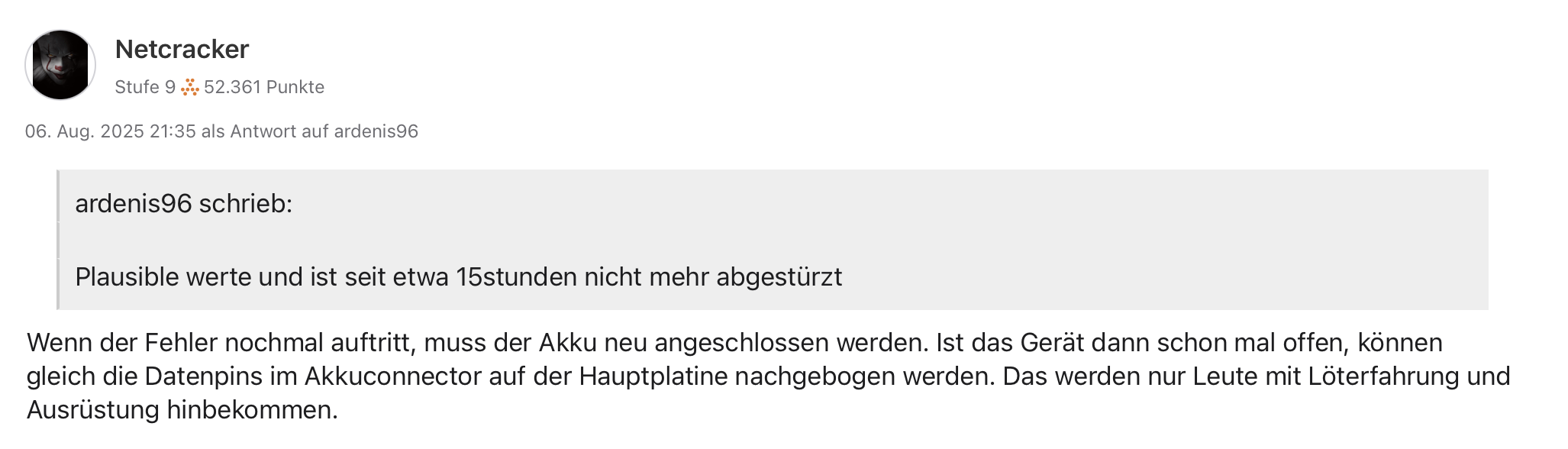 Wenn der Fehler nochmal auftritt, muss der Akku neu angeschlossen werden. Ist das Gerät dann schon mal offen, können gleich die Datenpins im Akkuconnector auf der Hauptplatine nachgebogen werden. Das werden nur Leute mit Löterfahrung und Ausrüstung hinbekommen.