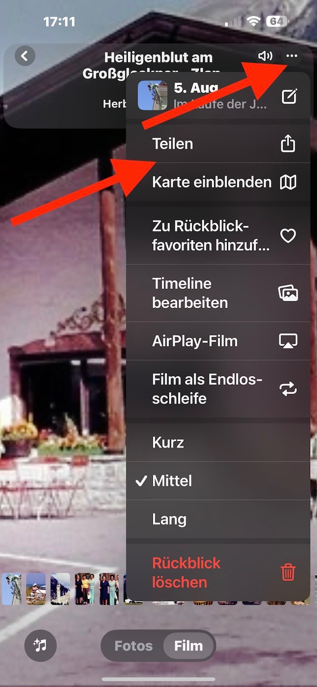 Unter iOS 18.6 erscheint der Button zum Teilen in dem Menü mit den drei Punkten oben rechts, während der Rückblick als Film wiedergegeben wird, wenn man auf den Film tippt.