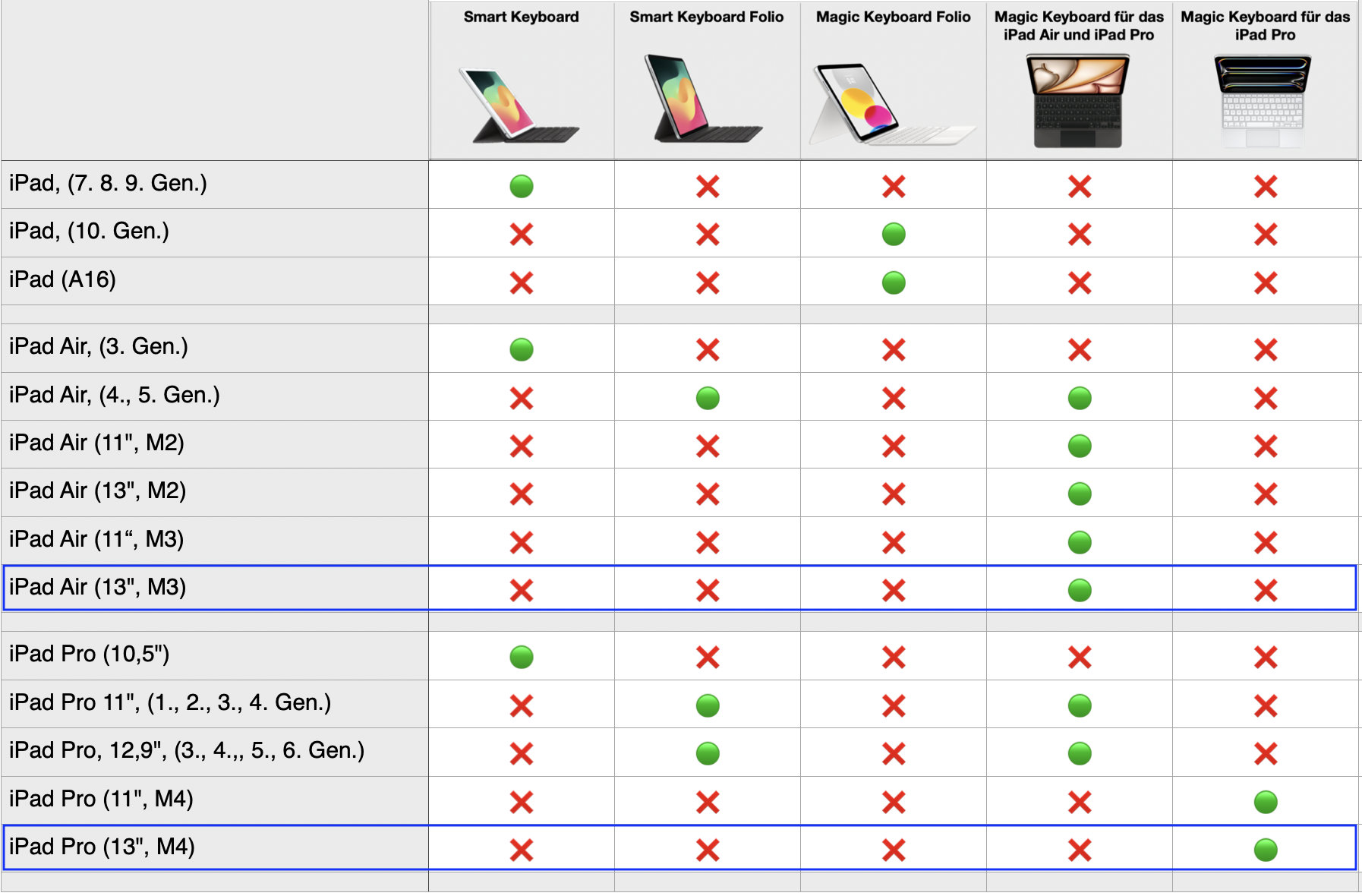Meine Frage daher: Kann ich das Magic Keyboard, das ich für das iPad Pro 13" M4 gekauft habe auch mit dem iPad Air 13" (M3) nutzen oder ist es nicht perfekt miteinander kompatibel? Sollte ich das Keyboard lieber auch zurückgeben und ein separates Keyboard für das iPad Air 13" kaufen? Ich habe bei Amazon bemerkt, dass dort speziell eines mit der Bezeichnung "Apple Magic Keyboard Case für das 13" iPad Air" gelistet ist. Ist das identisch zu meinem iPad Pro 13" Keyboard oder in irgendeiner Form anders?