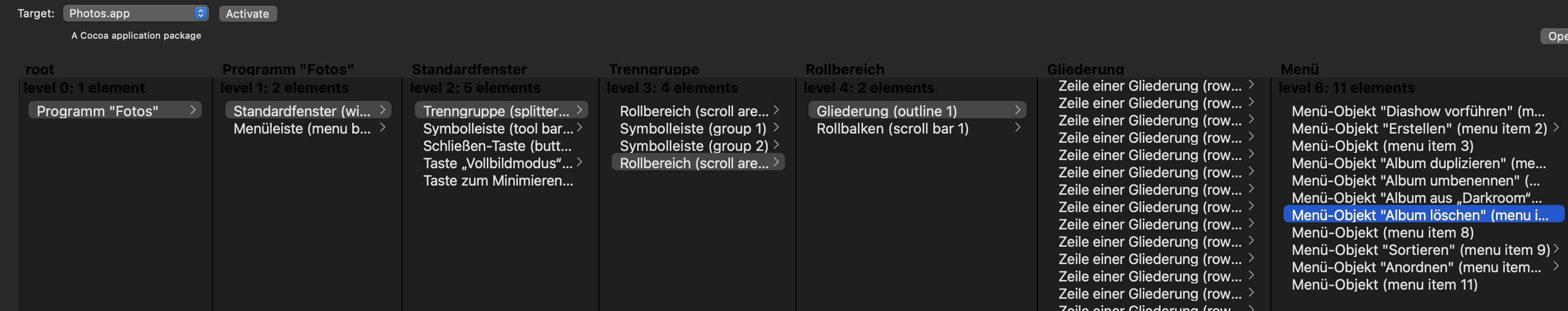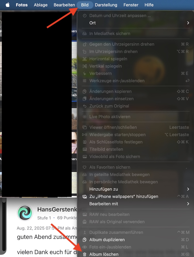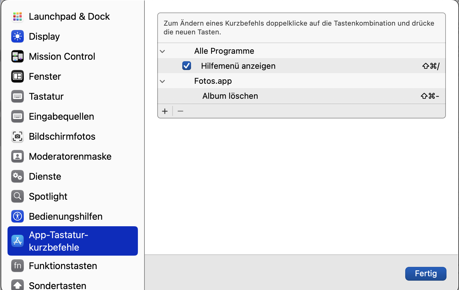 ich möchte, wie bei anderen Tastaturbefehlen, in der Fotos-App ein Album anklicken und dann mit einem Tastaturbefehl löschen. Dazu habe ich einen App-Tastatur-Kurzbefehl hinzugefügt