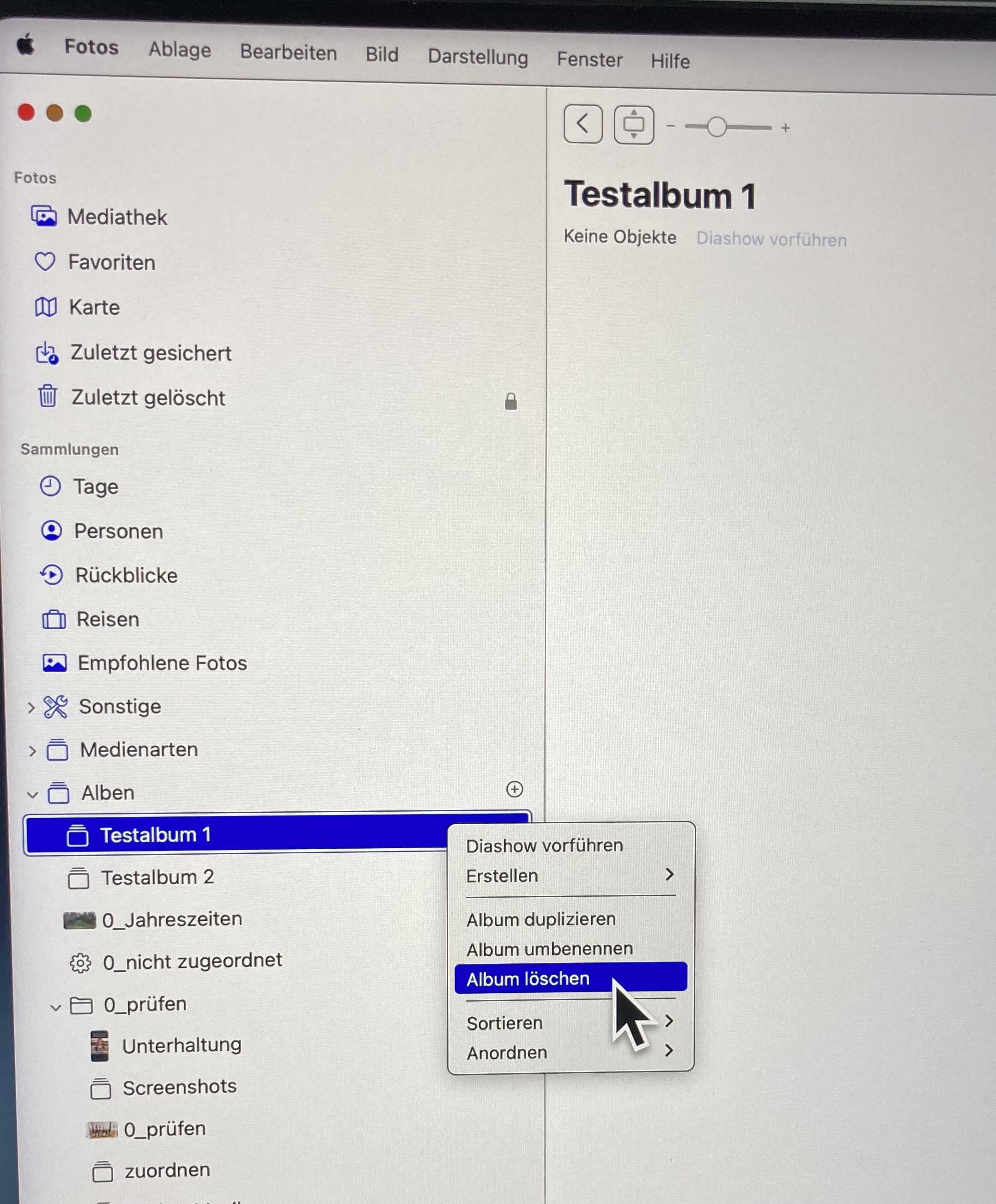 ich möchte, wie bei anderen Tastaturbefehlen, in der Fotos-App ein Album anklicken und dann mit einem Tastaturbefehl löschen. Dazu habe ich einen App-Tastatur-Kurzbefehl hinzugefügt