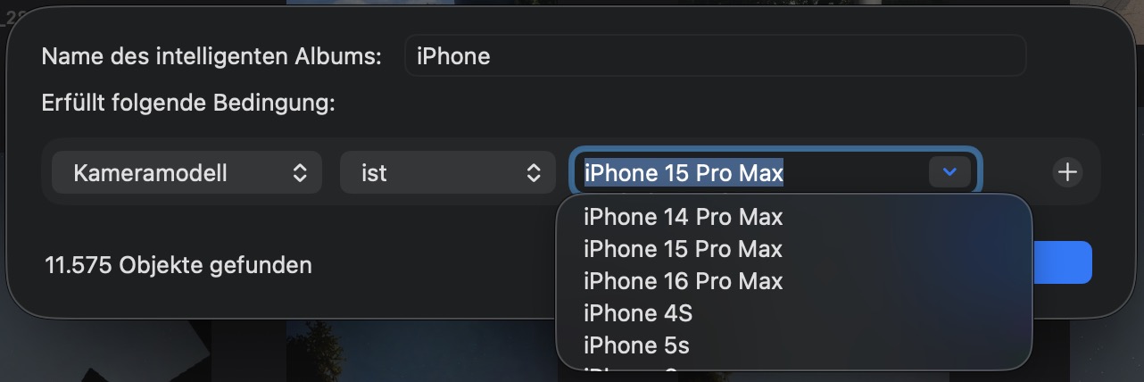 Um alle Fotos zu finden, die du mit deinem iPhone aufgenommen hast, lege am besten ein intelligentes Album an: