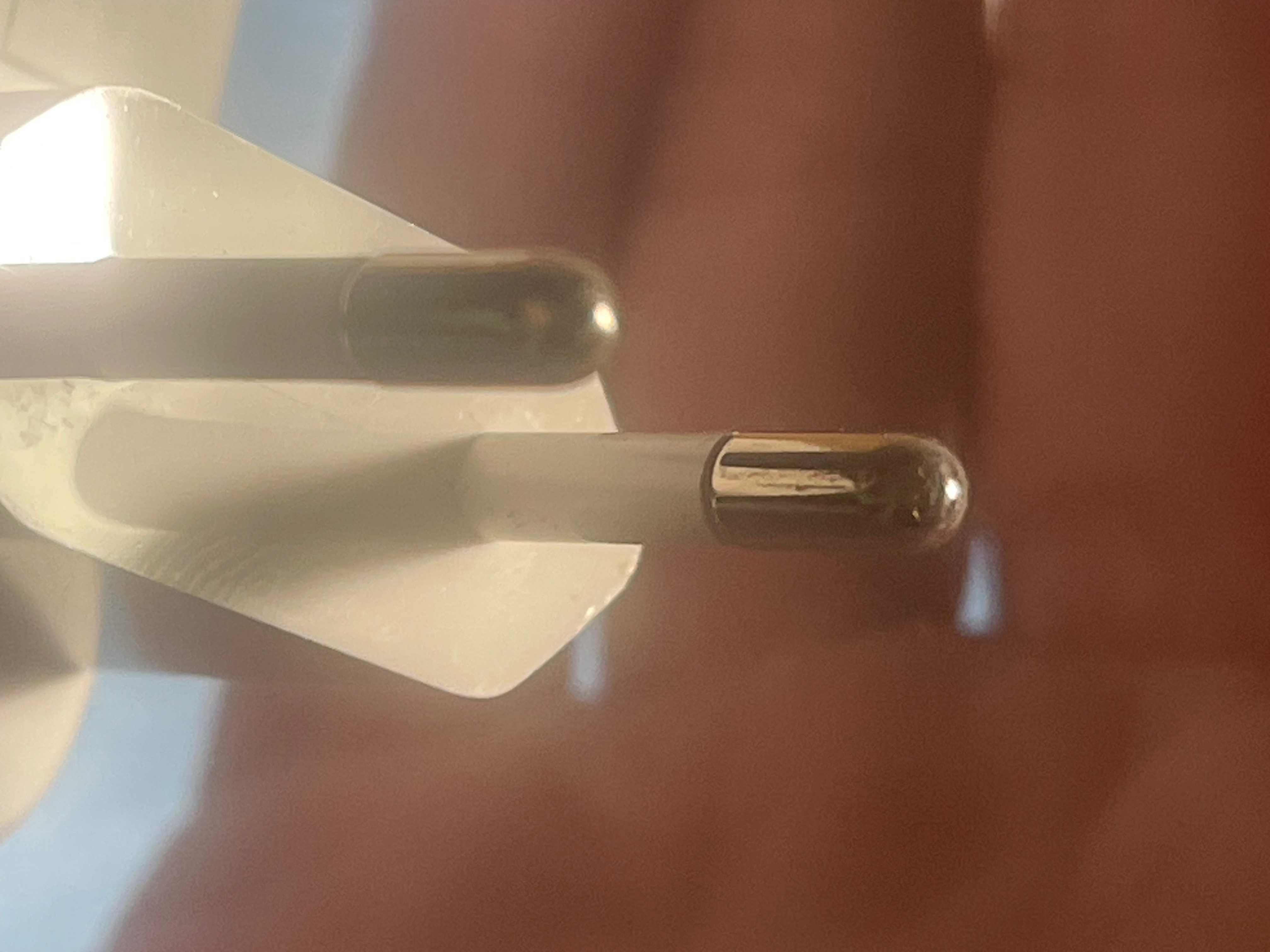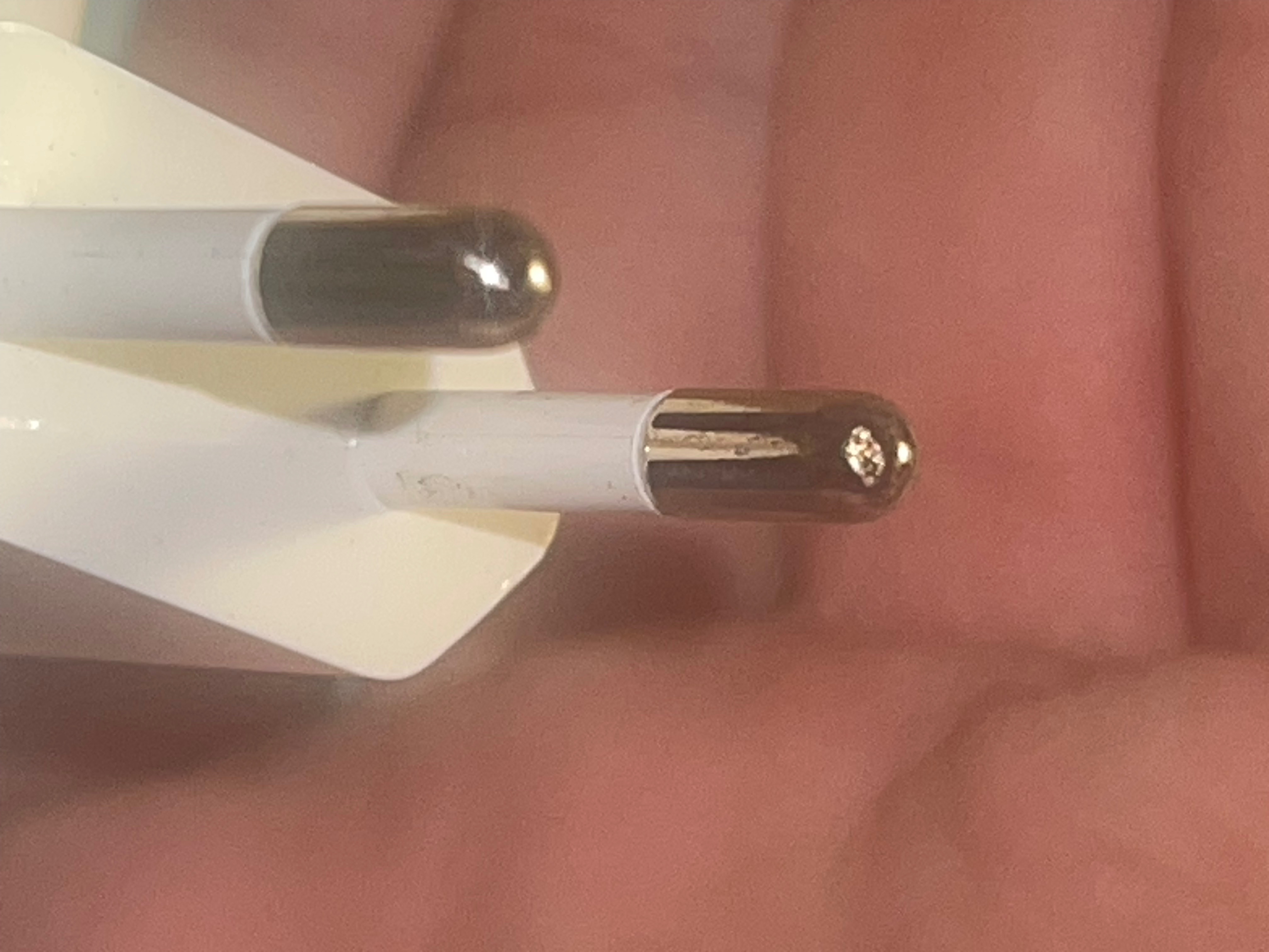 Manchmal sah ich kurze Funken in der Steckdose beim einstecken (habe ich auch bei anderen Sachen schon öfter gesehen also hatte ich keine Panik) aber jetzt sehe ich auf diesen beiden Kontakten so etwas schwarz, Silber schimmernde "Brandstellen" oder ähnliches an der selben stelle