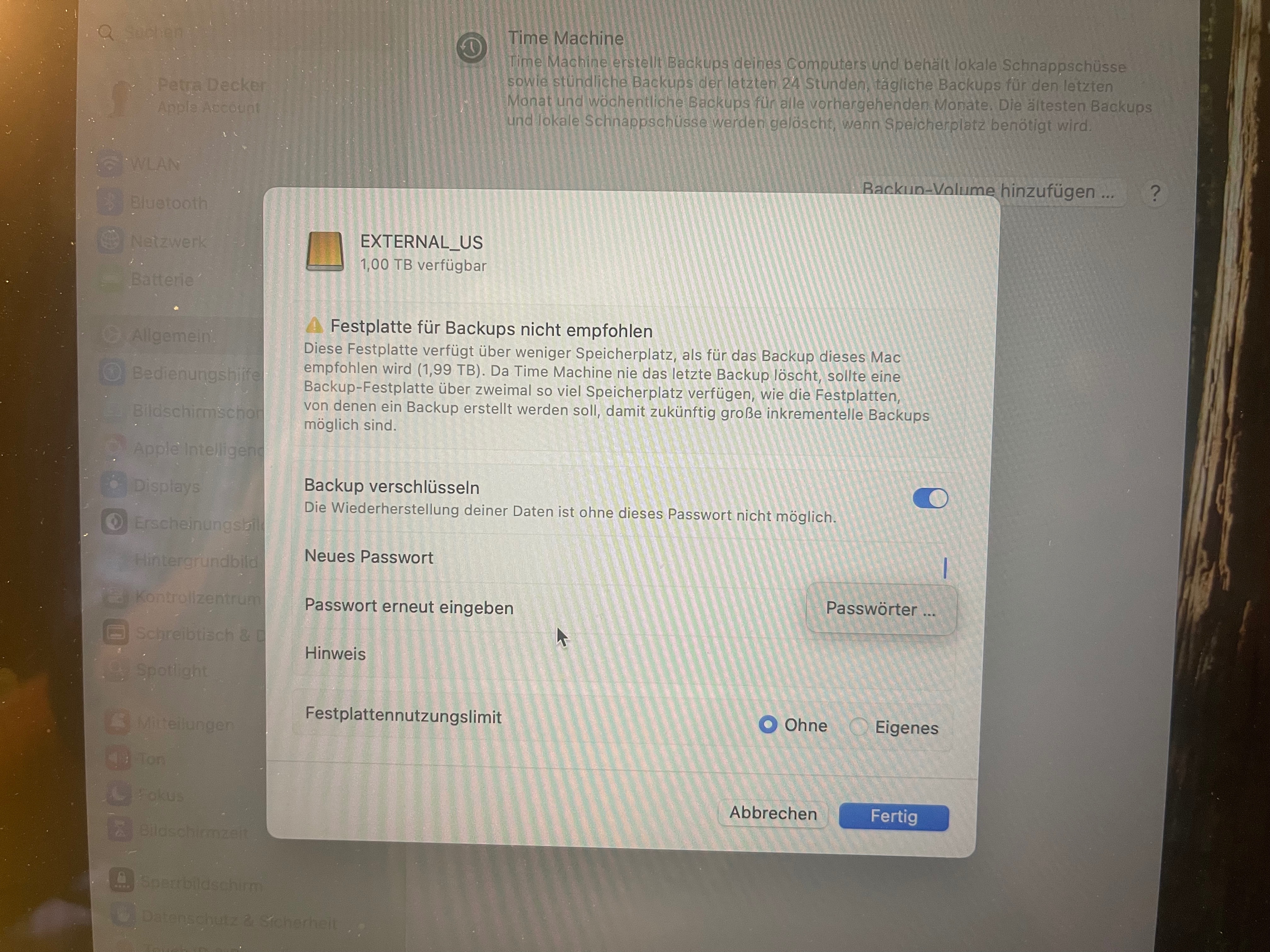 Aktuell lasse ich die Festplatte immer hängen, außer ich "bewege" das MB zu einen anderen Ort. Vorher wurde ein neues Backup erstellt (Jede Stunde aber nur bei WLAN Verbindung) und da stand in der Leiste oben etwa 5000 Änderungen! Ich habe Ja nur die Keynote geschaut und ein video aufgenommen. Das war etwas seltsam