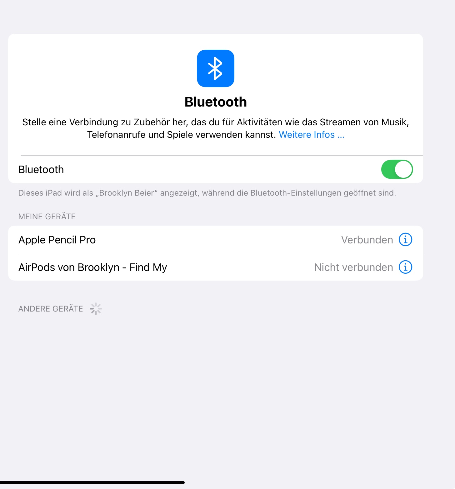 ich Habe mein apple pencil ist auch mit Bluetooth verbunden wenn ich dann auf wo ist geh dann auf Geräte>>apple Pencil hinzufügen>>pencil hinzufügen>> dann muss man warten und nach einer Zeit kommt dann das