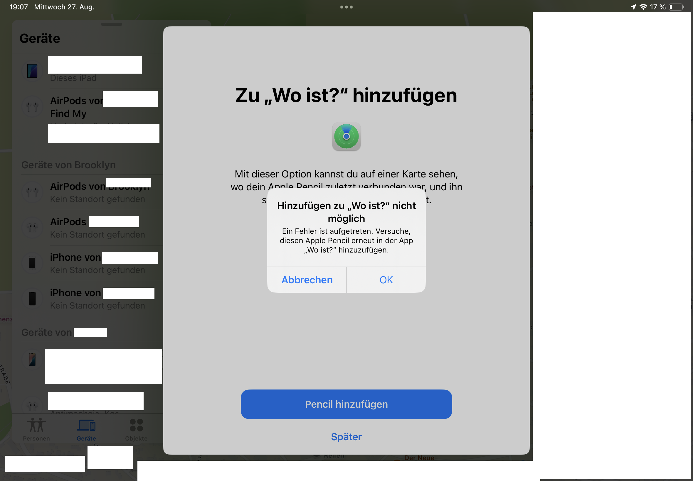 Apple Pencil Pro lässt sich nicht bei einem iPad Air 11 bei „Wo ist?“ hinzufügen