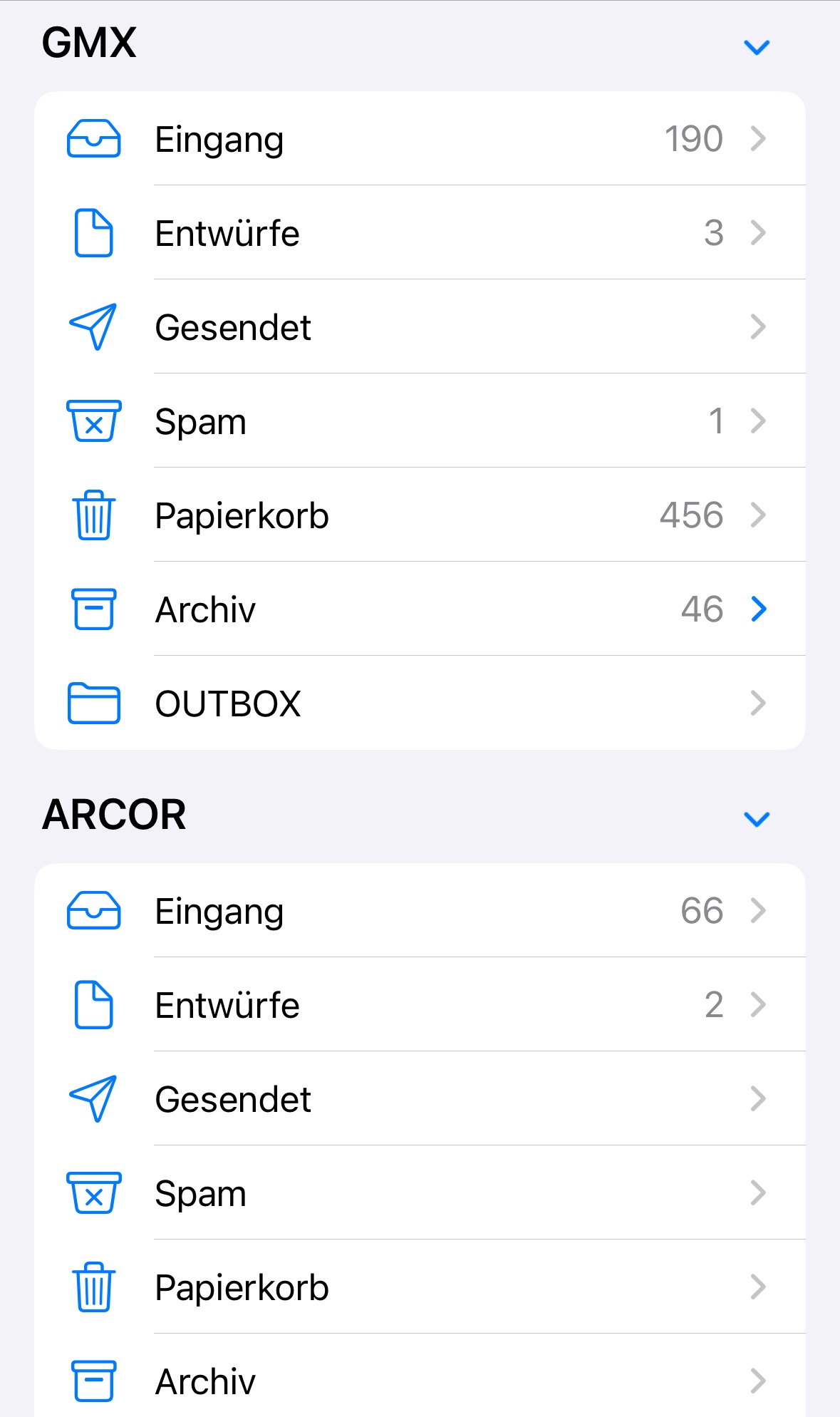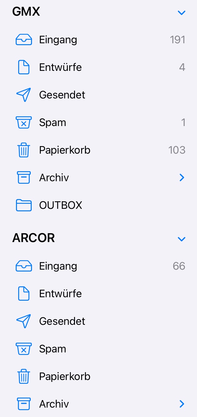 iPhone und MacBook - kein "blauer Pfeil" neben Arcor Archiv --> Ordner lässt sich nicht aufklappen, Unterordner nicht auswählbar, GMX Archiv funktioniert --> Vorschläge und Verschieben in Archivunterordner nicht möglich