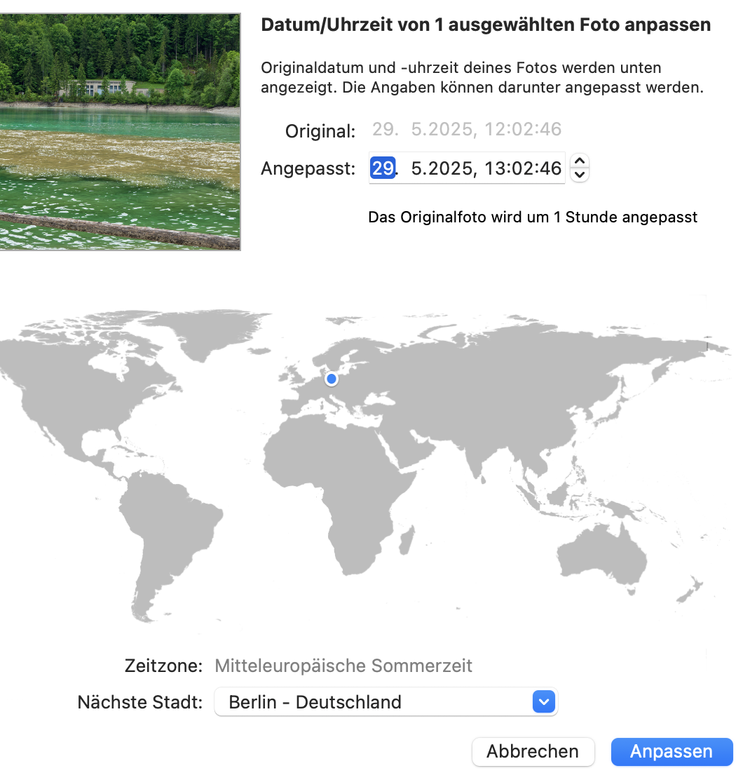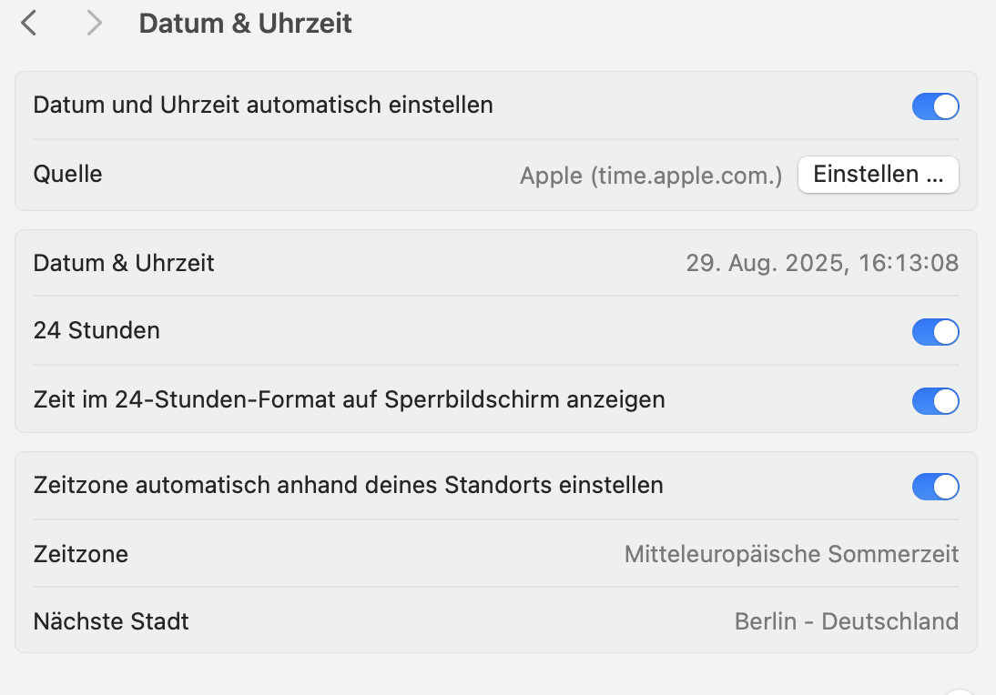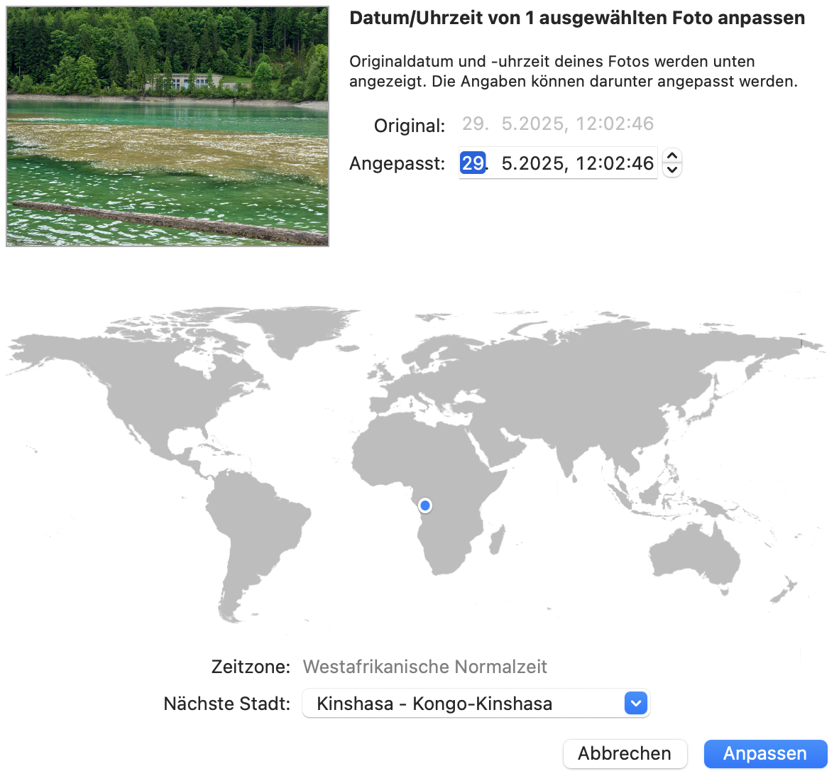 Also die Zeitzonen sind bei Kamera und iPhone gleich, ebenso befindet sich der Mac in der gleichen Zeitzone Berlin. Eines bleibt für mich allerdings ein Rätsel: bei den Kamera-Fotos ist laut Mac in den Informationen als Zeitzone Westafrikanische Normalzeit / nächste Stadt Luanda angegeben. Bei Kamera Fotos im Juni 2025 ist im Mac die Zeitzone Westafrikanische Normalzeit / nächste Stadt Lagos Nigeria erschienen. Bei Kamera Fotos im Januar 2025 ist in den Informationen die korrekte Zeitzone Mitteleuropäische Sommerzeit / nächste Stadt Berlin-Deutschland angegeben. In den Allgemeinen Einstellungen des Macs ist bei Datum/Uhrzeit auch die korrekte Zeitzone/nächste Stadt (Berlin) enthalten.