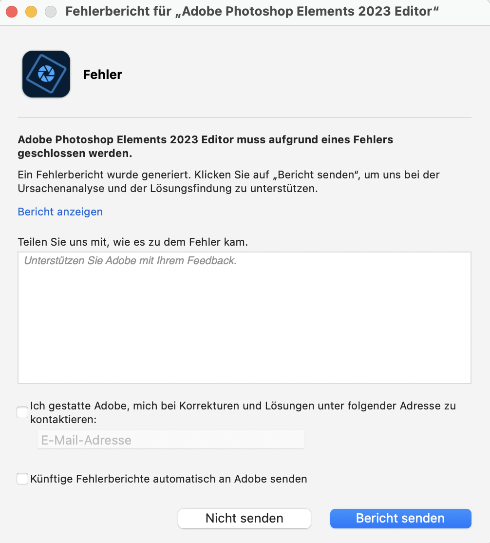 Bei Photoshop Elements 2023 ist es so: ich öffne im Editor die Voreinstellungen; wenn ich dort ein Feld öffnen möchte, z.B Land-/Regionsauswahl, stürzt das Programm ab und zeigt eine Fehlermeldung. Hab diese auch schon mit Feedback an Photoshop gesandt.