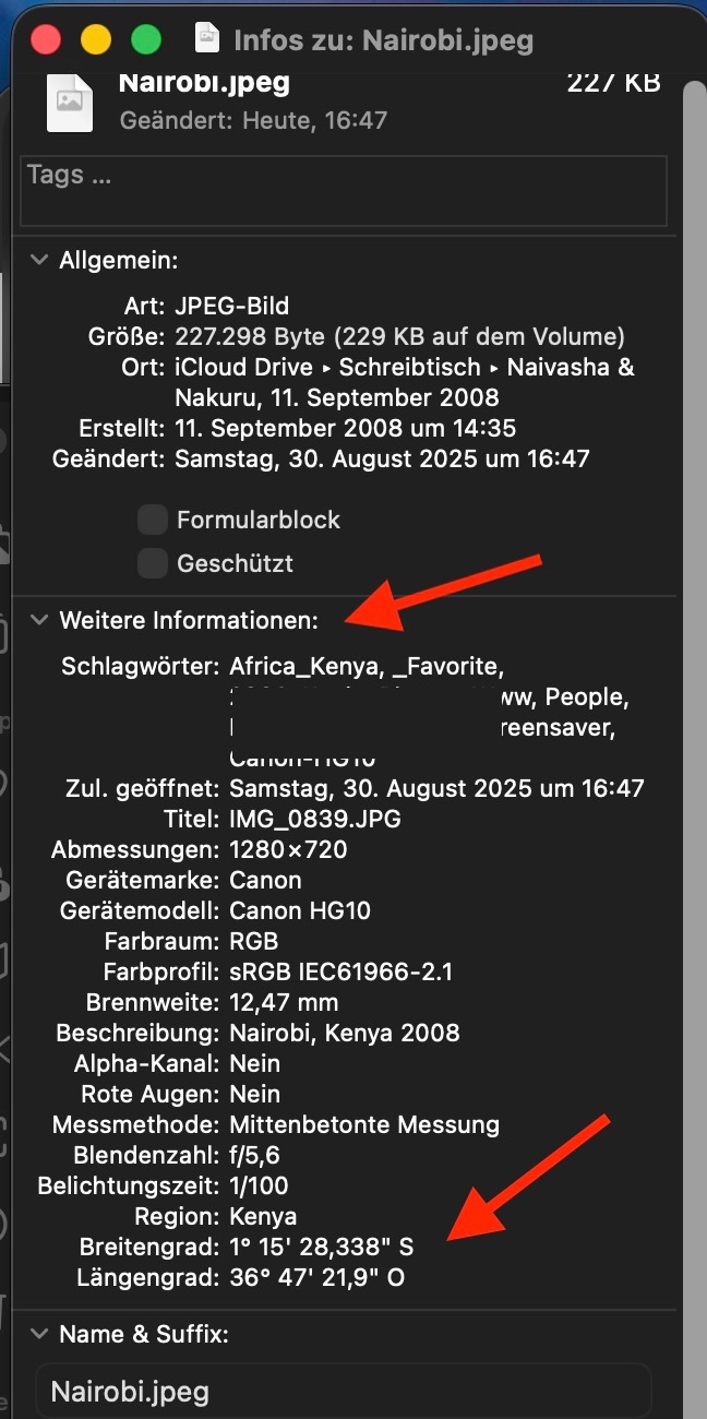 Es wurde keine Orte manuell zugeteilt. Bis April 2025 war bei den RAW's und JPEG's jeweils die richtige Zeitzone "Berlin" angegeben. Erst ab Mai 2025 werden falsche Zeitzonen bei den bearbeiteten JPEG's ersichtlich (afrikanische Städte). Im Finder werden bei den JPEG's in den Informationen keine Koordinaten gezeigt.