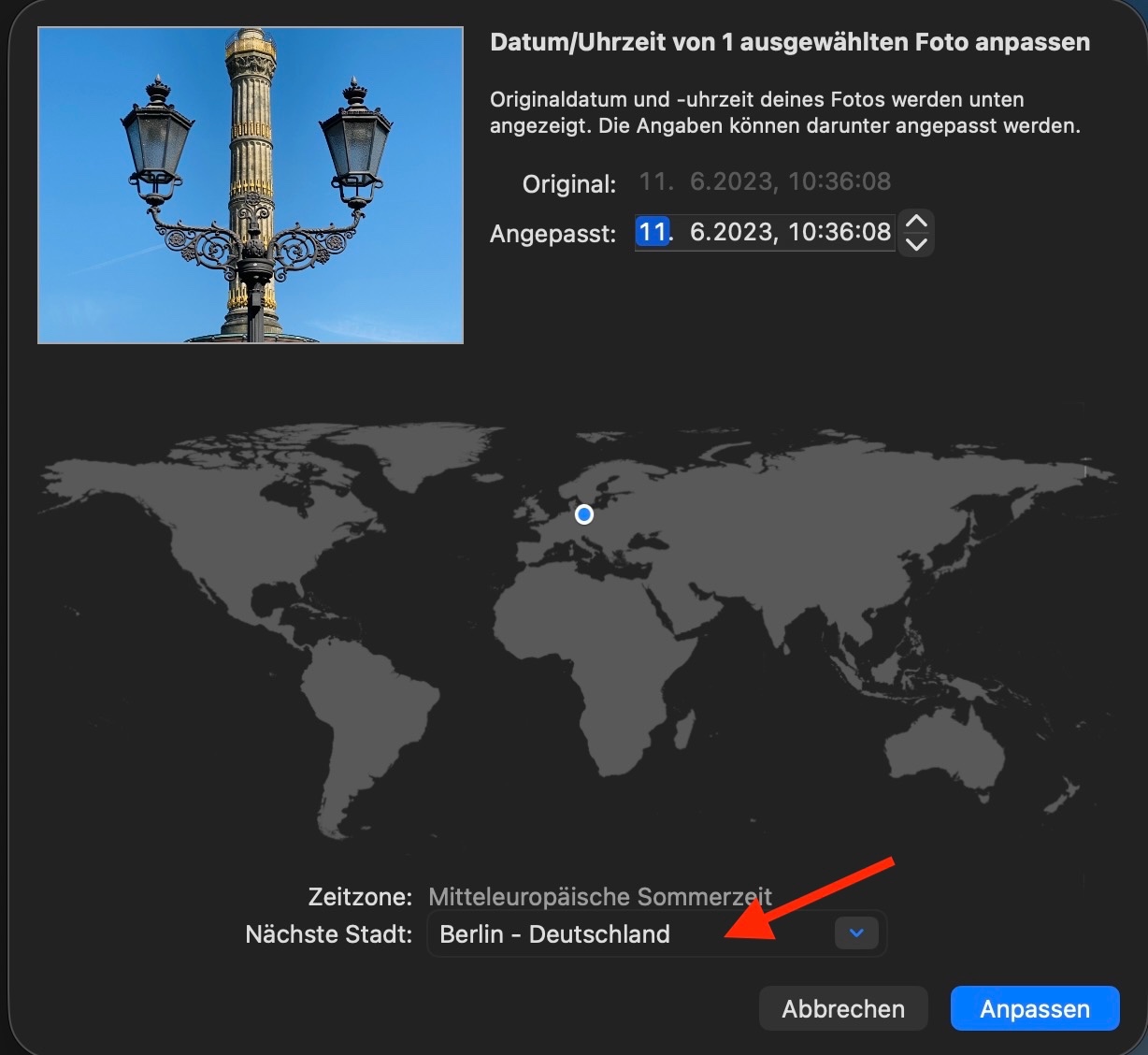 Du kannst am Mac Segen, welche Zeitzone den Aufnahmedaten der Bilder zugeordnet worden ist. Wähle in Fotos ein Bild aus, das mit de Kamera aufgenommen wird und gehe in das Menü "Bild > Datum und Uhrzeit anpassen". In diesem Dialog siehst du ganz unter die Zeile "Nächste Stadt". Liegt diese Stadt in der richtigen Zeitzone?
