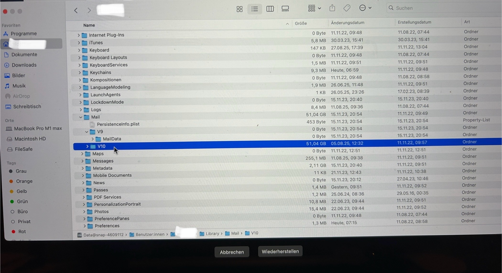 Hallo, meine Festplatte habe ich auf der TimeCapsule gesichert. Nach einem Systemabsturz musste ich leider feststellen, dass die auf der HD gespeicherten Mails nicht mehr wiederhergestellt werden. Ich suche nun das Verzeichnis auf der TimeCapsule um zu prüfen, ob die Mails noch vorhanden sind. Hat jemand eine Idee, wo sich dieses Verzeichnis "versteckt" - bzw. wie man nach einem konkreten Verzeichnis auf der TimeCapsule suchen kann?